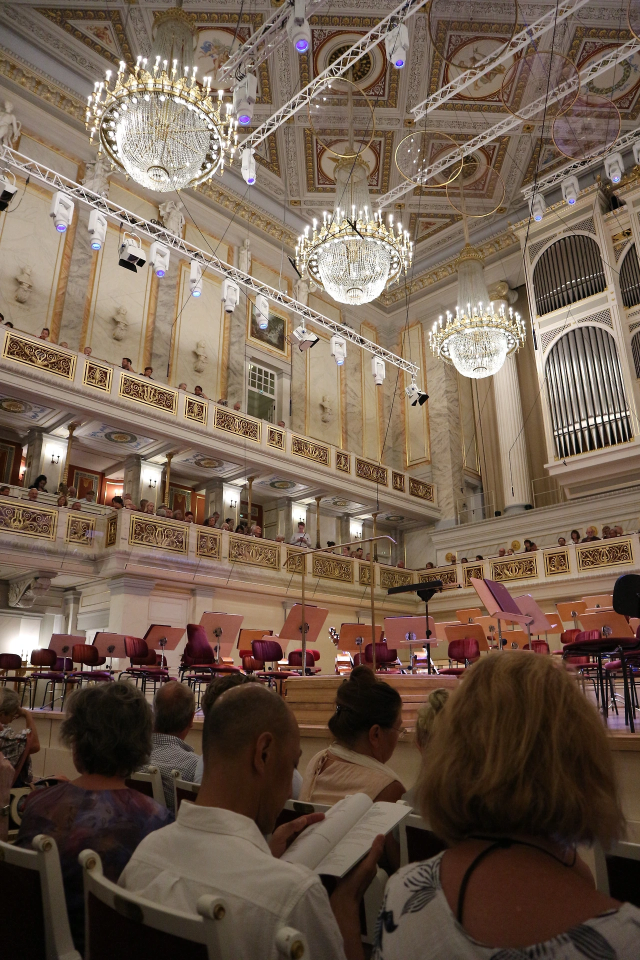 운 좋게 앞에서 세 번째 줄에 앉게 되어 기쁜 마음으로 리허설을 기다렸다. 한국의 공연장들에 비하면 오케스트라 단원들의 자리가 굉장히 객석 쪽에 붙은 모양새였다. 조금 과장해, 조금 움직임이 과하면 객석으로 나동그라질 것 같은 느낌? 하지만 그만큼 연주자들이 ‘나와 가까운 존재’라는 느낌도 있었다. 이렇게 가까운 오케스트라 단원들의 자리 중에서도 무대 맨 앞에 놓인 지휘대에, 나의 ‘최애(最愛)’ 지휘자 중 한 명인 에센바흐가 나왔다. 평생 왕성한 연주활동을 하며 수많은 명반(名盤)을 남긴 이 분도 이제는 79세! 사회자와 함께 나와 인삿말과 10분 정도의 인터뷰까지 했는데, 모든 내용은 독일어로만 진행되었다. 영어와 겹치는 발음이 별로 없는 단어들의 연속이라, 내용은 잘 이해할 수 없었지만, 아무튼 날씨 좋은 일요일에 ‘공짜 음악회’를 보러 온 관객들에게 적합한, 매우 친절한 형식의 음악회였다. 곡 전체를 연주하는 공연이 아닌 만큼, 몇몇 관객은 문간에 서있다 나갔다 들어오기도 하는 등 시종일관 편안한 분위기에서 진행되었고, 일단 리허설이 시작되자 지휘자 에센바흐는 관객을 별로 의식하지 않은 채, (내 느낌에는) 평소와 다름없이 오케스트라 연습과 리허설에 집중했다.