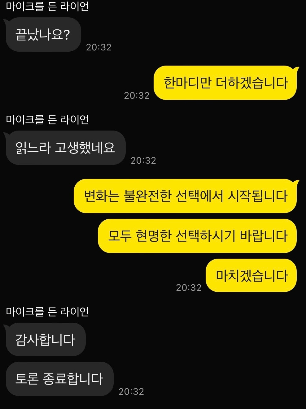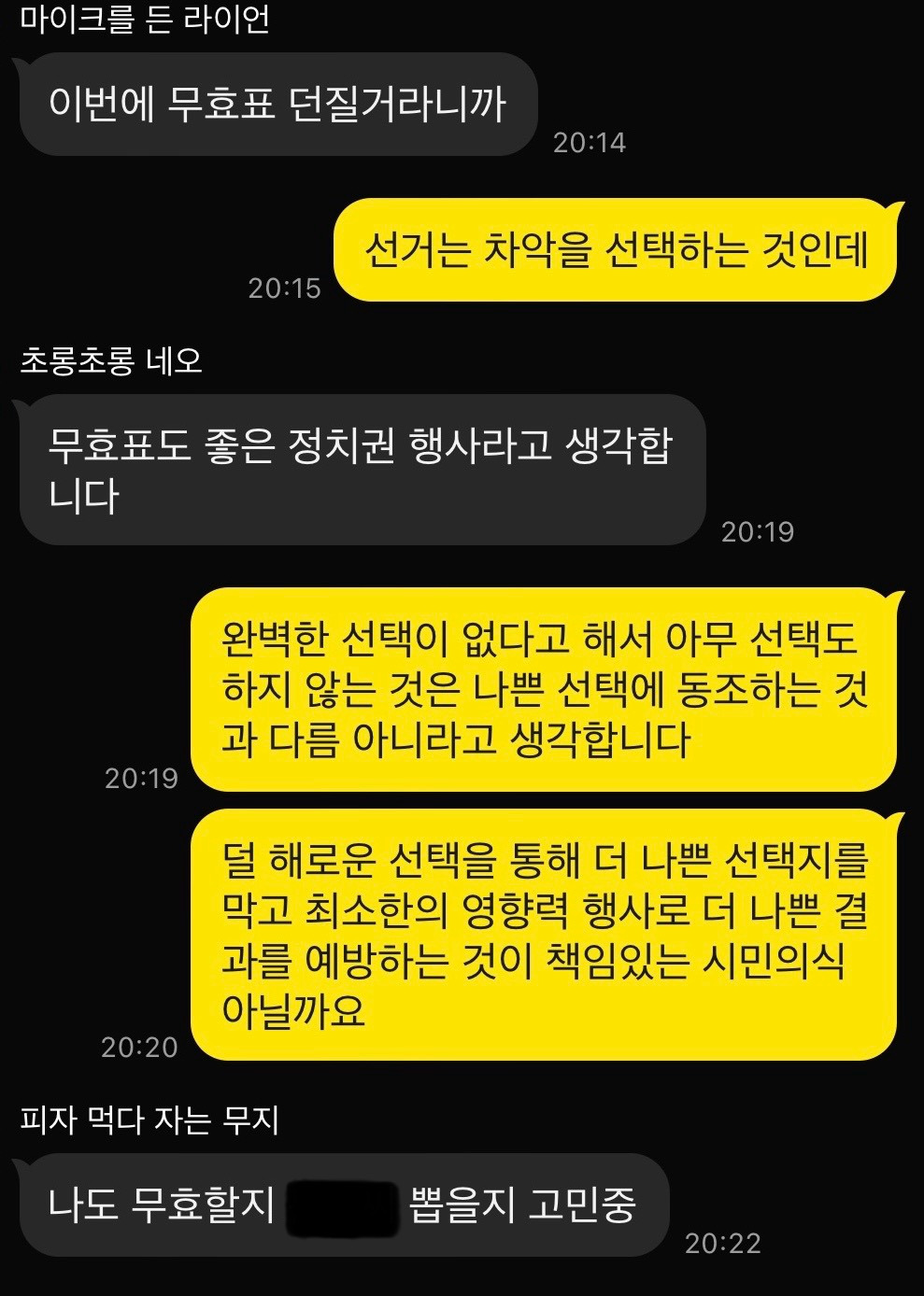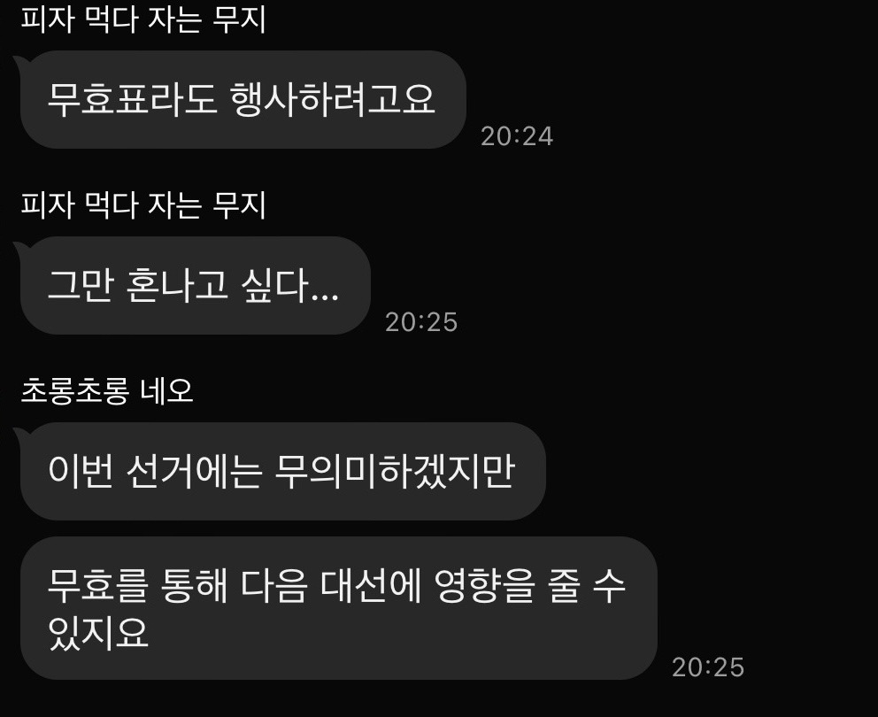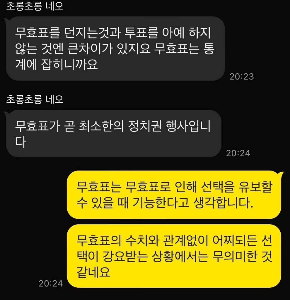 오늘 저녁 친구들과 나눈 대화이다. 말투가 좀 이상한데 의견이 다를 때 감정이 상해서 싸우지 않기 위해 우리끼리 형성된 쿠션어 같은 것이다. 아무튼 무효표를 던질 것이라는 친구의 말에 갑론을박이 오갔다. 무효표는 정치적 불만과 실망을 표현하는 하나의 정치적 저항 행위라는 주장과 무효표는 정치적으로 아무런 실효를 가지지 못한다는 주장이 첨예하게 대립했다. 나는 최선을 다해 설득했고 선택은 각자에 맡겼다. 하지만 대화는 아직 끝나지 않았다.