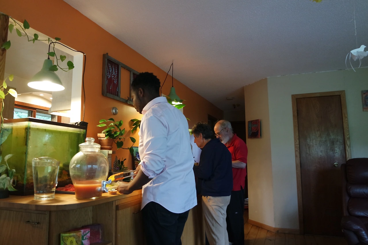 저녁에는 엘리네 Alt하우스에서 파티가 있단다. 23세 남자 봉사자인 션의 생일이다. 이번 주말에는 우리 집, 그것도 우리 옆 방으로 이사를 온단다. 파티에 간다고 하니 아이들도 은근 기대를 하고 옷차림에 신경을 쓴다. 다른 봉사자, 식구들도 파티라는 격식에 맞게 나름대로 치마, 와이셔츠를 챙겨 입고 왔다. 엘리는 테이블 세팅을 해 놓고 음식을 준비해 놓았다. 그녀는 미술을 전공했다. 그 집에 있는 그림, 소품들을 직접 만들었다고 한다. 엘리의 남편이 밖에서 스테이크를 굽고 있다. 오랜만에 맛보는 고기 냄새에 아이들이 흥분했다. 과일주스, 아이스크림, 파이, 와인까지 맛볼 수 있으니 파티 느낌이 물씬 풍긴다. 우리도 미리 준비해 온 선물 한 개를 내민다.