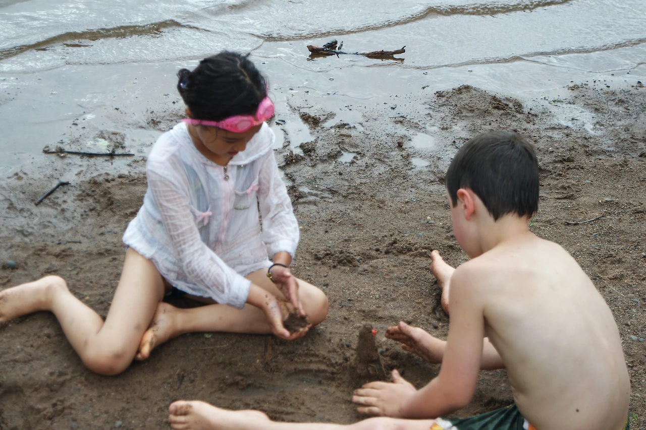 강물에는 조안네 아이들 둘, 우리 집 아이들 둘... 이렇게 넷만 들어갔다. 조안이 튜브, 물총, 장난감을 한껏 챙겨 왔다. 아이들은 물속에서 자유를 만끽하며 즐겁게 놀고 있다. 어른들은 잔디에 앉아서 햇볕을 쐬고 아이들이 노는 모습을 구경하고 있다. 날씨 때문인지 모기가 너무 많다. 하늘이 화창해졌다 흐려졌다 오락가락한다. 한 시간 정도 물속에서 놀던 아이들이 춥다고 나왔다. 간식을 먹고 짐을 챙겨서 바비큐 장소로 이동했다. 그런데 아까보다 모기가 더 많아졌다.