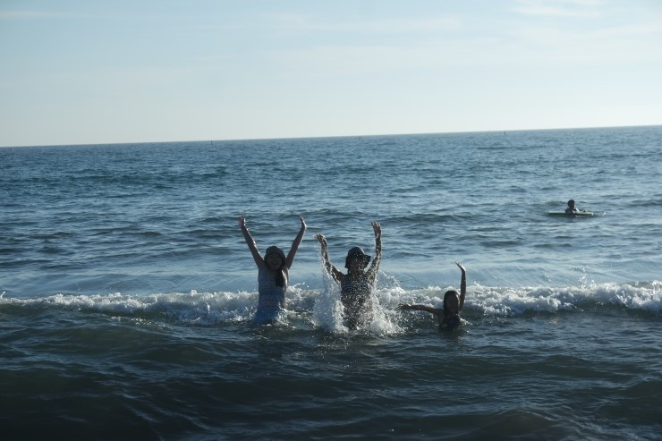 산타모니카 부둣가에 낚시질하는 사람들이 꽤 많다. 새가 사람들이 던져주는 바나나를 먹고 않고 연주하는 사람 곁에 평화롭게 앉아있다. 밀려드는 파도를 향해 몸을 날리고 점프를 하면서 모두 신이 났다. 어찌나 즐거운지 우산 펴 들고 모래에 앉아 짐을 지키는 내 귀에까지 웃음소리가 들린다. 들어갈까 말까 망설이다가 남편과 교대를 해서 나도 물속으로 첨벙했다. 두 아이들의 손을 잡고 제대로 밀려드는 파도에 부딪쳤다. 이제야 여름휴가를 온 느낌이 난다. 파도타기는 역시 산타모니카 해변이다. 물에 들어오기를 잘 한 것 같다. 얼추 3시간 가까이 물에서 놀았다. 일몰이 시작되니 사진을 찍으려는 인파들이 몰린다. 여기에서 일몰도 역시 아름답다~