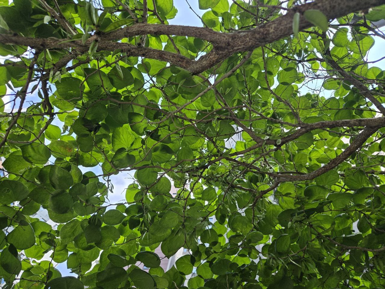 여름, 밑동에서 바라보는 박태기나무 캐노피는 참 편안하다. 둥글넓적한 잎 끝이 약간 안쪽으로 말려 있다. 잎 수백 장이 하늘을 꽉 채웠다. 비 오는 날 우산은 없고, 어른들이 손끝을 힘을 쥐며 아이들 머리를 가려준다. 꼭 그러는 것만 같다. 캐노피 아래 덜 익은, 얇은 콩꼬투리들이 주렁주렁 풍요롭다. 덩달아 1~2시간만 앉아 있으면 햇빛과 구름 그리고 박태기나무 잎이 만들어내는 초록빛 농담(濃淡)을 즐길 수 있다. 삶에 낙망스럽다가도 이 순간만큼은 담박하고, 끝내 쓸쓸하다.