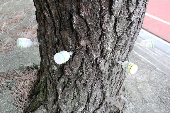 또 나무주사라는 것이다. 길을 가다, 혹은 숲 속에서 소나무 밑동 부근 플라스틱 통이 꽂혀 있는 것을 쉽게 볼 수 있다. 그게 바로 '나무주사'다. '나무주사'라는 이름은 뭔가 나무를 낫게 하는 '약'이 들어 있을 것이라고 생각하게끔 하지만 실제로는 세계보건기구가 '고독성'이라고 분류하는 살충제인 '아바멕틴' 같은 농약을 주입하는 것이 그 실체다. 당연히 나무주사를 주입한 소나무, 잣나무 등의 소나무류는 큰 타격을 입는다. '나무주사'를 맞았는데, 소나무는 활력을 잃거나 죽게 되는 경우도 있다. 매년 살충제를 나무의 물관 조직에 직접 주입한다.'나무주사'를 맞은 소나무의 단면을 잘라보면 살충제 주입된 부분을 격리시키기 위해 조직 까맣게 죽어서 돌처럼 변해 있음을 알 수 있다.