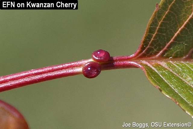 꽃과 곤충의 관계가 이렇게 번식의 문을 열어준다면, 잎과 개미의 관계는 생존의 문을 지킵니다. 벚나무 일부 종의 잎자루 끝에는 작은 꿀샘이 달려 있습니다. 꽃과는 관계없는 자리입니다. 잎이 아직 연할 때 그곳에서 단물이 맺히고, 개미가 모입니다.