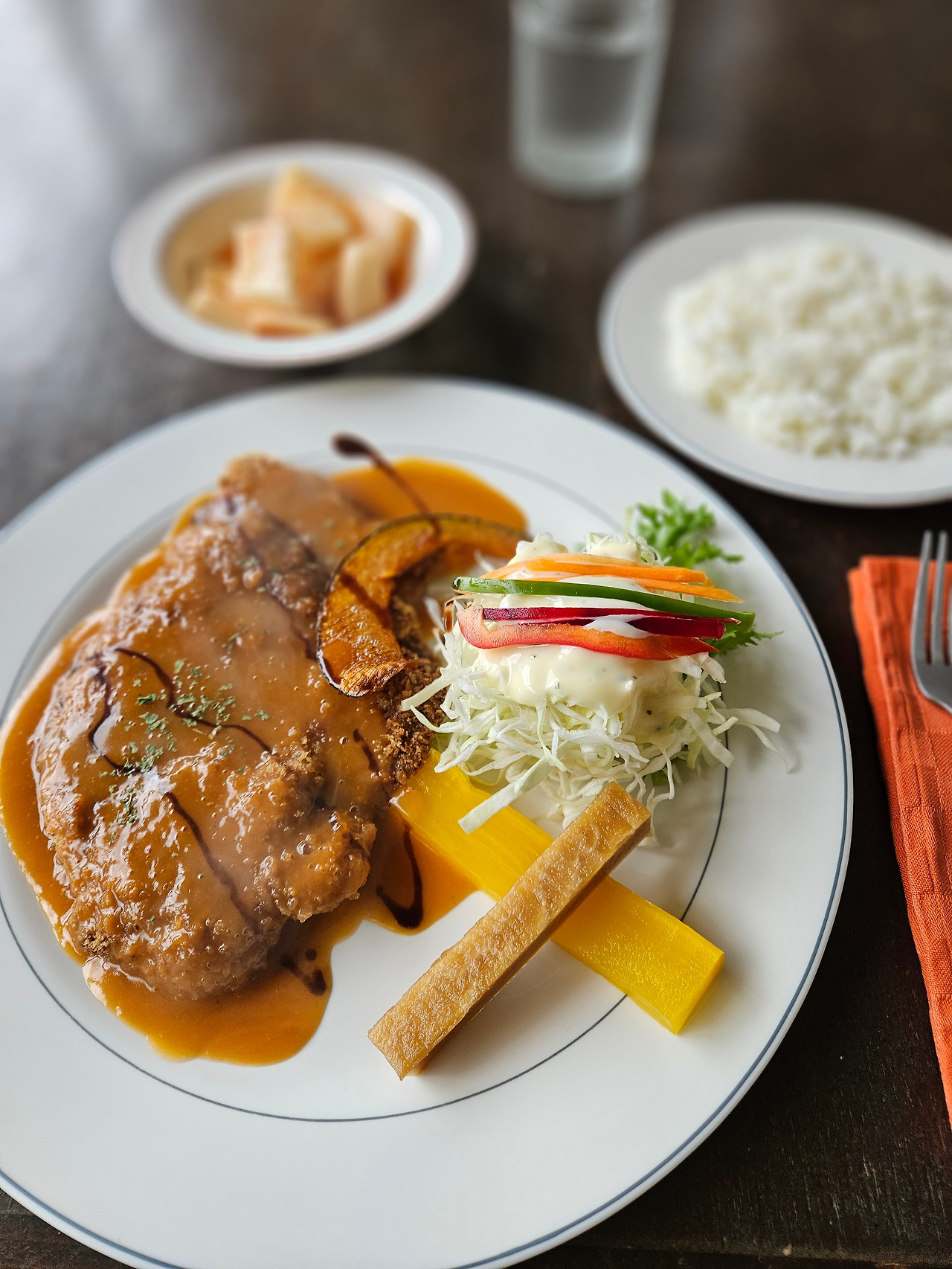제주 연동시내에서 묵으며 혼자 식사할 곳을 찾았다. 흑돼지 돈가스가 맛있다는 블로그 몇 개 아래 옛날 경양식 콘셉트의 돈가스를 파는 집이 있다는 게시글을 찾았다. 지역민들이 자주 가는 제주 연동의 숨은 맛집이란다. 어디 웹툰에서 언급되면서 이름이 알려진 모양이다. 일요일엔 휴무라서 월요일 오후 늦게 식당을 찾았다. 경양식 콘셉트의 돈가스를 파는 식당이 아니라 원래 옛날 경양식 돈가스를 파는 식당이었다. 따로 콘셉트를 잡은 게 아니라 오래전 자기 고유의 모습을 간직하고 있는 식당이었던 것이다.