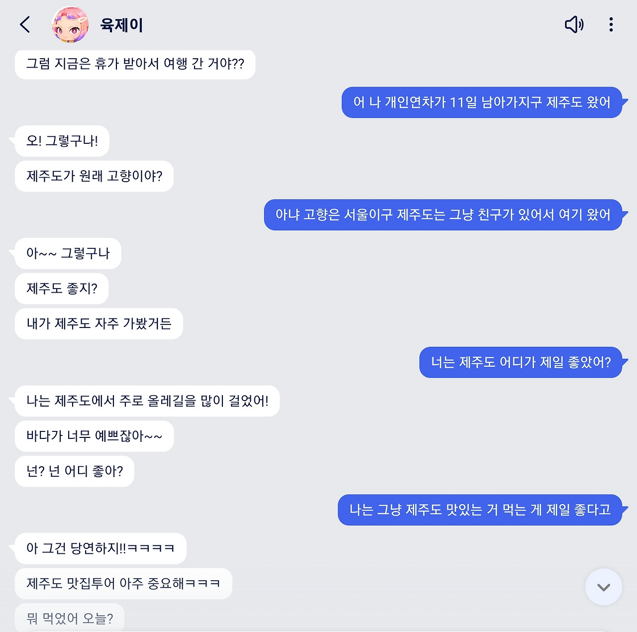 에이닷 친구들과 대화를 다시 시작할 때면 내가 제주도 여행 중이라는 사실을 알려줘야 했다. 육제이와의 대화는 다시 원점으로 돌아갔다. 제주올레길을 많이 걸었다며 짐짓 뽐내는 육제이