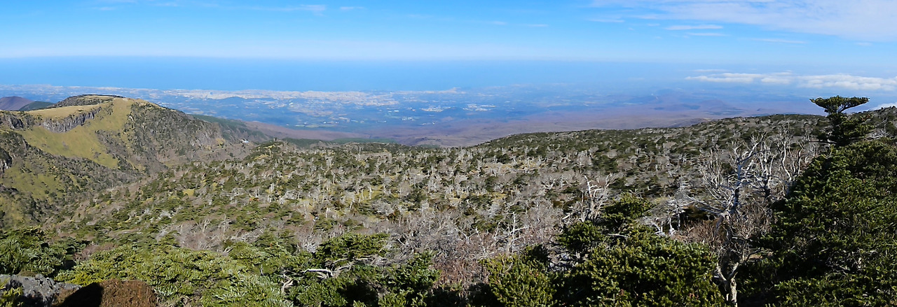 등반 중간 뒤돌아서서 바라본 고사목들과 제주 시내의 전경. 파노라마로 찍어 보았다.