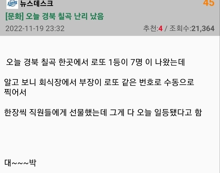 지난 주말, 로또 당첨 1등이 경북 칠곡에서 7명이나 나왔는데, 모회사 부장님이 회식 때 직원들한테 사준 수동 로또라고 하네요. 회식하면서 부장님이 기분 좋게 로또 한 장씩 쏘신 거 같은데요. 사실인지 모르겠으나 어쨌든 그 회사 사람들은 그 부장님 덕에 대박을 맞았습니다. 직장생활의 소소한 추억거리가 인생을 바꿀 수도 있는 전환점이 된 거 같아 재미있었습니다.