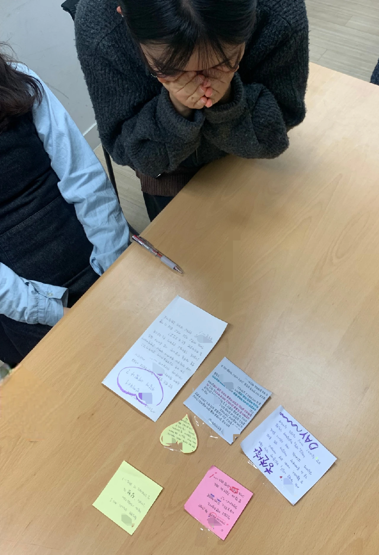 각자의 칭찬을 손으로 써서, 누군가는 타이핑을 통해 혹은 메모장에 그림을 그려 전달한 후 칭찬을 받을 당사자가 직접 상대방들의 글을 읽어 주었다. 동시에 서로의 마음과 눈빛을 나누었다. 느낌을 공유하고 각자의 생각과 일상을 나누니 또 하루를 살아갈 활력소가 되었다. 일이 힘들었는지 프로그램이 감동이었는지 잘은 모르겠으나 모두들 눈물과 웃음으로 서로를 위로한 시간이 되었다.