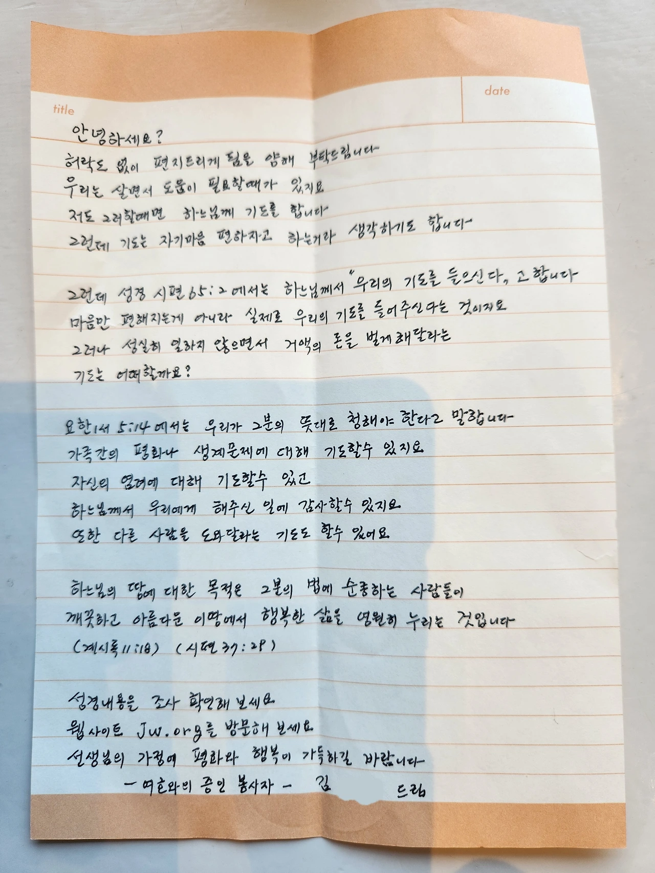 (손편지를 보내주신 여호와의 증인 봉사자 김**님 죄송합니다)