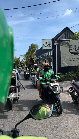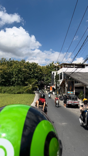 교통 체증 때문에 발리에서 택시보다 더 많이, 자주 이용하는 바이크 서비스, GoJek이나 Grab을 탈 때에는처음 만나는 라이더라는 사람과 매우 가까워진다. 한국에서도 전혀 타본 적 없던 오토바이 뒷자리였다. 처음 라이더가 도착해서 뒷자리에 타야 했을 땐 이렇게 누군가와 가까이 교통수단을 같이 타도 되는 것인지 난감했다. 그 와중에 대체 어디를 잡아야 하는지 - 라이더를 잡아야 하는지 바이크에 잡는 부분이 있는건지 - 발은 어디에 둬야 하는건지, 라이더를 잡기엔 조금 부담스러운데 그럼 운전할 때 밸런스는 대체 어떻게 잡아야 하는건지 혼란스럽기만 했다… ! 그래서 맨 처음 나는 라이더 옆구리의 유니폼을 살포시 손가락으로 잡는 것으로 스스로 합의점을 찾았다. 하지만 몇 번의 라이딩 후 바이크에 익숙해지고 나서는 두 발을 받침대에 올리고 기립근에 힘을 준 다음 라이더와 꽤 여유로운 간격으로 떨어져 앉아서 심지어 두 손으로 폰을 하는 방법을 익혔다. 어쩄든 하루에도 대여섯번씩 타는 바이크에서 자연스럽게 다른 사람과 적정한 거리를 유지하는 법을 배운 셈이지만 여전히 내 바로 눈 앞에 있는 라이더가 생소할 때가 많았다. (라이더 헬멧 너무 내 눈 앞에 있는거 아니에요...?)