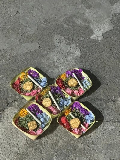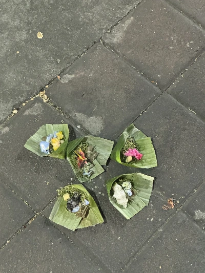 마지막으로 발리는 신과도 가까운 곳이다. 처음 발리에 가면 사람이 북적이는 번화가이든 다소 외진 곳이든 상관없이 건물이나 가게, 집 앞 바닥에 바나나잎이나 코코넛잎으로 만든 손바닥만한 바구니가 놓여있는 것을 발견할 수 있다. '차낭 사리 Canang sari' 라고 불리는 이 작은 바구니 안에는 꽃, 쌀, 간식, 오일, 담배나 향이 담겨져 있는데 힌두교에서 신에게 감사함을 표현하고 악을 막기 위해 바치는 공양물들이다. 매일 세 번 바쳐야 하기 때문에 모든 건물 앞, 바다로 가는 문, 작은 다리, 사거리 등에서 카낭 사리 바구니들이 몇 개씩 쌓여있는 걸 볼 수 있다. 힌두교가 발리에서만 특이하게 발현된 방식이라고 하니, 힌두교도가 아닌 나 또한 길을 갈 때 밟지 않기 위해 걸음을 조심하게 된다. 그리고 이를 바친 그들의 정성과 마음을 한 번 더 떠올리게 된다. 그러다 무심결에 고개를 들어 하늘을 보면 수많은 연들이 하늘 높이 날고 있다. (연이 저렇게까지 높이 갈 수 있다니!) 저 연들 또한 논과 수확을 관장하는 신에 대한 경배의 뜻이라고 한다. 그 곳에서 걸음을 옮기면 몇 분 지나지 않아 길 옆에서 사원들을 무수히 찾아볼 수 있다. 크고 삐까뻔쩍한 사원도 종종 있지만, 쉽게 발견할 수 있는 건 집 옆에 붙어 있는 작은 규모의 사원들이다. 찾아보니 마을 하나당 3개의 수호신 사원을 모시고, 집마다 조상을 모시는 사원을 가지고 있기 때문에 건물 하나 건너 사원 하나가 위치해 있는게 이상하지 않다. 발리에 높은 건물이 없는 이유도 사원보다 건물을 높게 지을 수 없어서라고 한다. 이렇게 발리인들의 일상과 하루에는 종교와 신이 가득하고 뗄레야 뗄 수 없이 가까이 붙어 있으니 이 곳에서 지내는 나같은 외국인 또한 원하든 원하지 않든 신과 가까이 지낼 수 밖에 없다. 나는 종교가 없지만 이런 차낭 사리와 연, 사원들이 눈에 띌 때마다 한 번 공연히 소원을 빌어보기도 했다, 무사히 이 여행을 마치고 돌아갈 수 있게 해주세요- 라고.