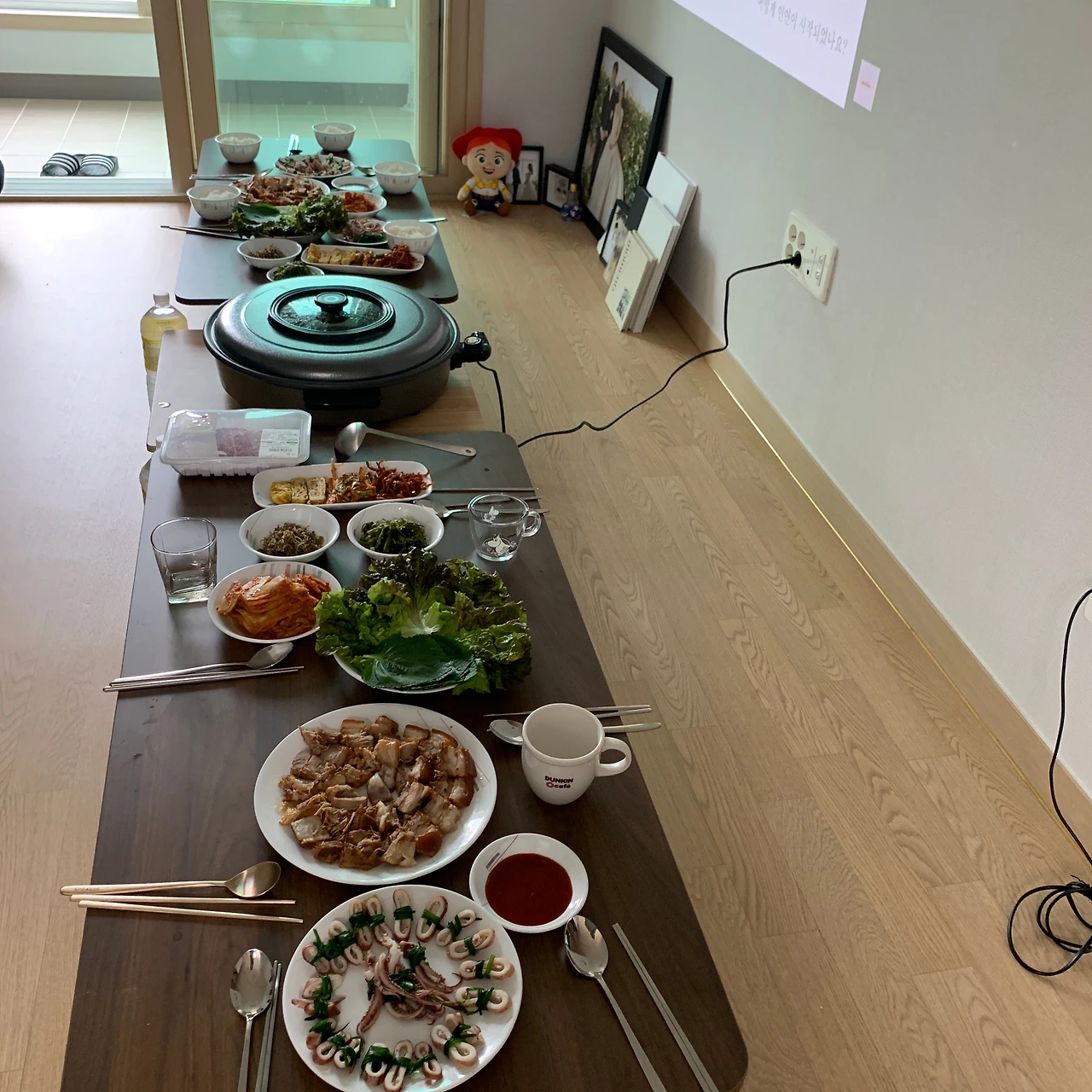 수육은 부드럽게 만들기 위해 3시간 정도 끓이고, 매운 등촌 칼국수 샤부샤부를 만들기 위해 난생처음 다진 양념도 만들었다. 오징어 숙회는 적당하게 삶고, 부추로 돌돌 말아줬다. 음식을 만들다 보니 어느새 시간이 훌쩍 갔고 손님들이 올 시간이 됐다.