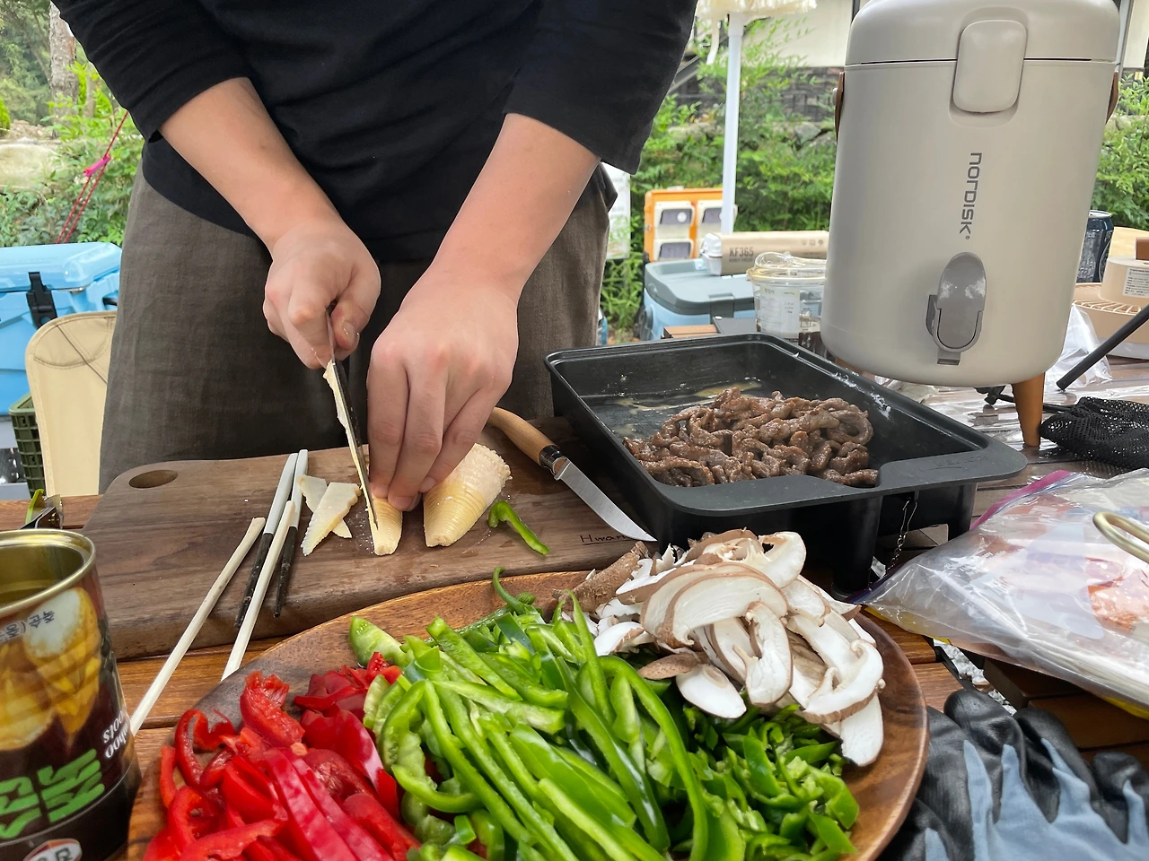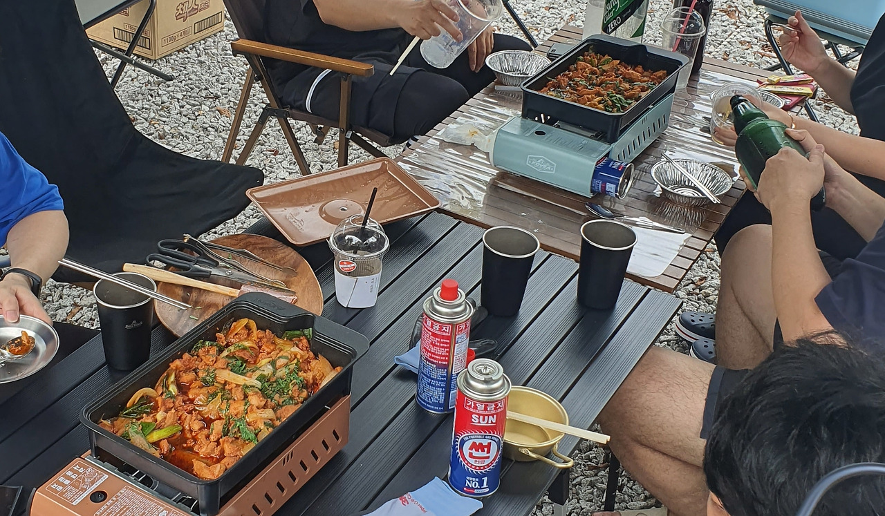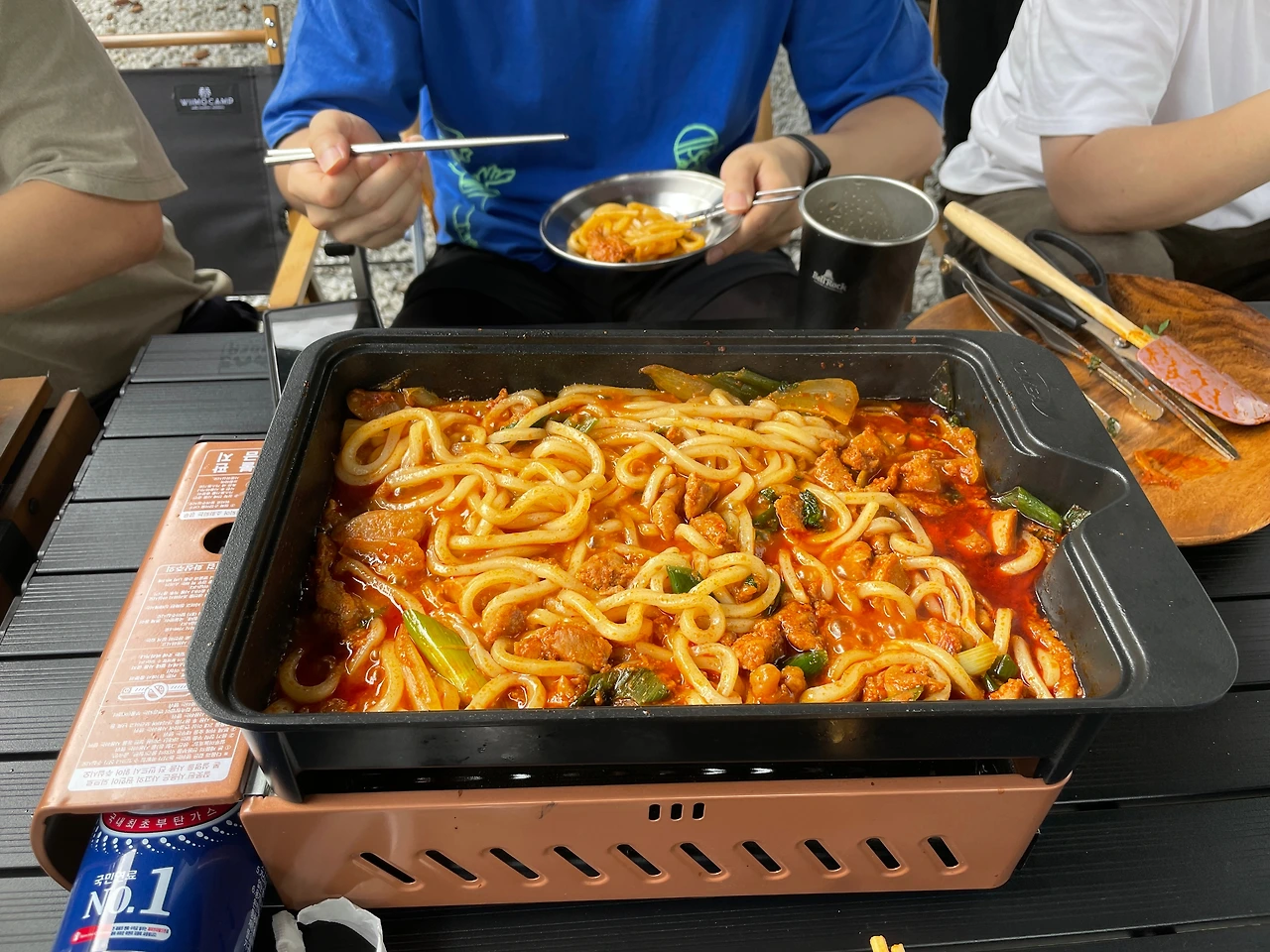 사이트 구축이 끝나고 테이블들을 정리하는데, 친구 한 명이 배고프다고 밥을 준비해달라고 했다. 점심 준비 시작해주세요?라는 말을 들으며 대충 무시하고 펼치던 테이블을 마저 펼쳤다. 어느 정도 정리가 되고 난 후에는 양념된 닭갈비를 꺼냈다. 양파와 파를 썰어 넣고, 두 명의 구이 바다에 나눠 담았다. 뚜껑을 덮어두고 잠깐 기다린 뒤에 점심을 해결했다. 가져간 우동사리도 같이.