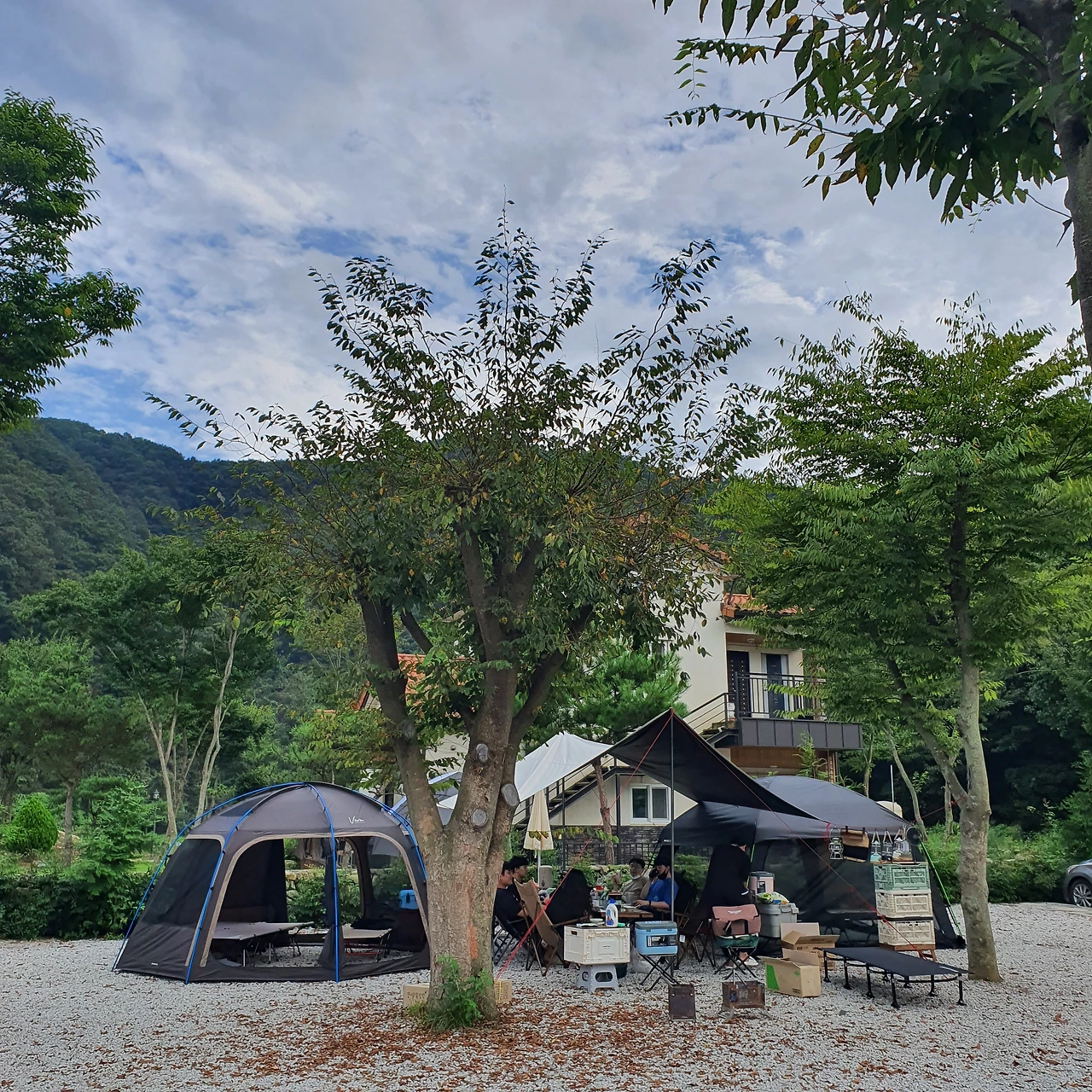 개별 사이트의 규모가 꽤 큰 곳이었다. 2개의 사이트가 붙여진 곳도 있었고. 도착하고 나서 정문에서 캠핑장 지기분께 백신 접종 완료를 점검받고, 방문등록을 마치고 후문 쪽으로 입장했다. 도착한 사람들의 짐을 모아서 사이트를 꾸렸다. 관리도 엄청 잘되고 있는 곳이고 수영장 글램핑 사이트 데크 사이트 펜션까지 함께 운영하는 곳이라 다양한 선택지로 가볼 수 있는 곳이지 싶다.
