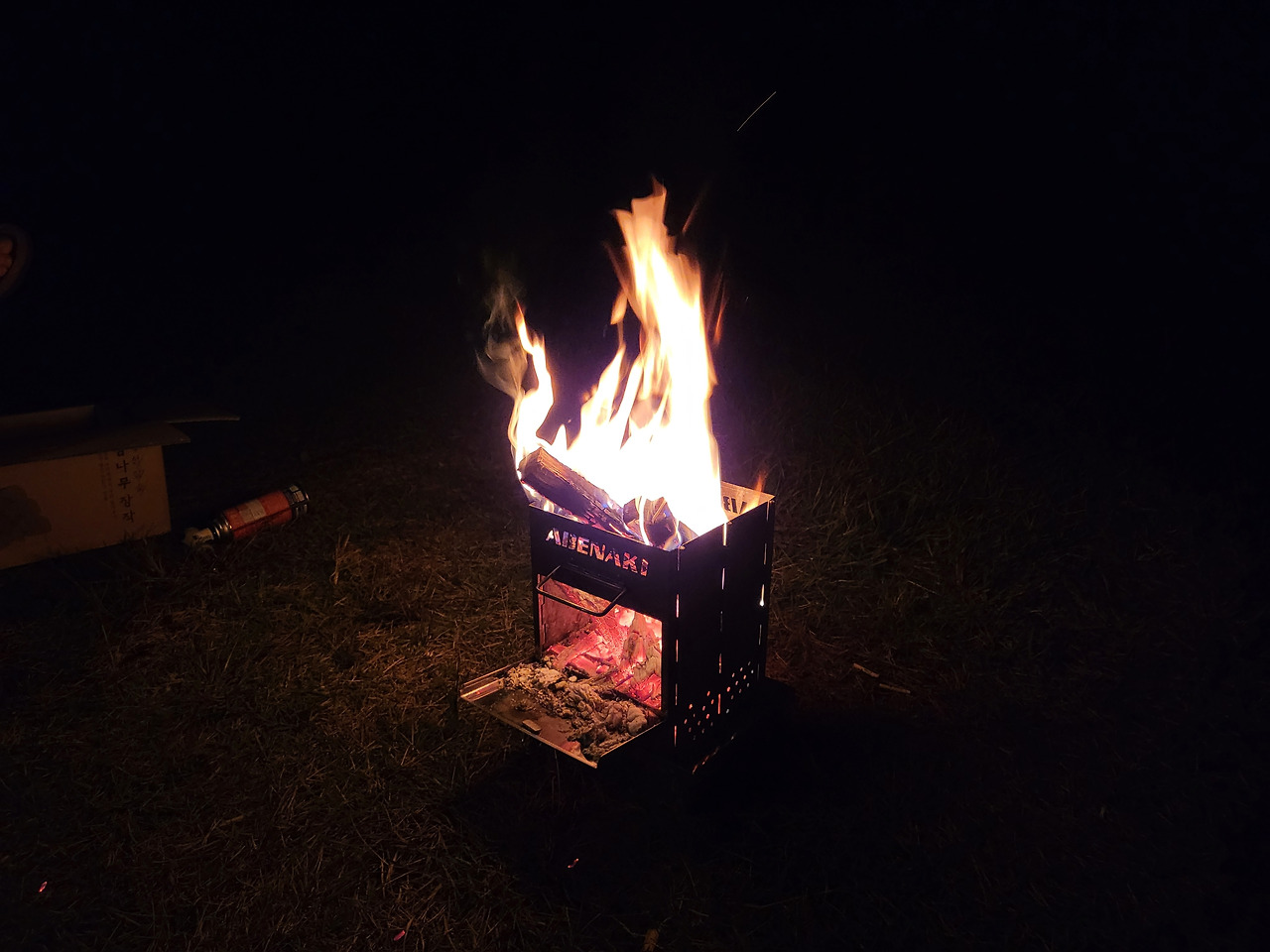 해가 떨어지고 기다리던 시간이 왔다. 랜턴을 킬 시간. 해가 완전히 진 것은 아니라 사진이 푸르게 나온 것이 랜턴을 켜고 싶어서 안달 난 마음을 대변한다. 주변도 조금 둘러보고 랜턴 위치도 조금씩 바꿔보면서 저녁을 맞이했다. 캠핑을 가서 보내는 시간의 대부분은 어떻게 사는지 이야기를 하거나, 즐겨 듣던 노래를 나눠 듣는 시간들이다. 거기에 더해 저녁으로 해 먹을 것들을 준비하고.
