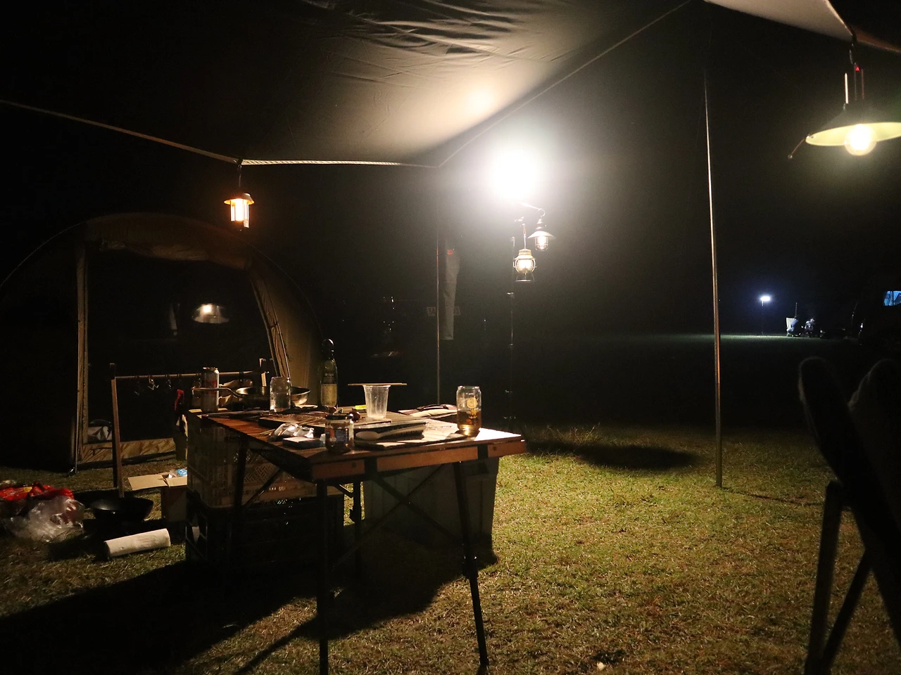 가져온 전등의 일부이다. 캠핑을 처음 시작할 때는 전등에 왜 그렇게 사람들이 돈을 쓰는지 이해가 되지 않았었다. 활동할 곳을 밝혀 줄 밝은 것 하나면 충분하지 않나. 그렇지만 몇 번의 밤을 지내고 나니 랜턴에 슬슬 관심이 가는 것이, 사람 마음은 다 비슷하고나 하는 생각이 들었다. 왼쪽 사진의 왼쪽은 길버트 랜턴( 좌측), 친구가 가져온 것은 보름달 무드등과 그린 에코 라이팅 두 개다. 밤이 되고 전등에 하나 둘 불을 켜면 왠지 모르게 아늑한 느낌이 든다.