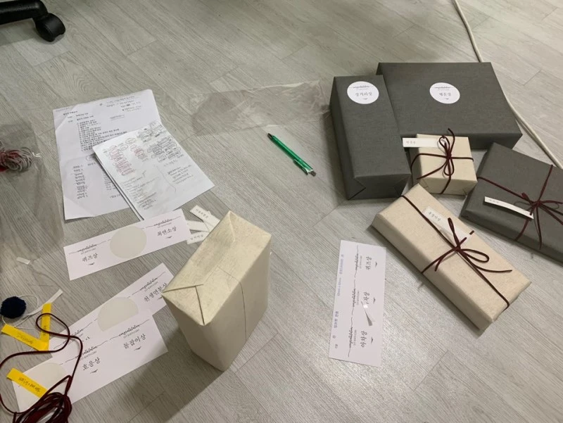 끈으로 묶는 거나 스티커 붙이는 거나 둘 다 고급져 보이고 좋다.