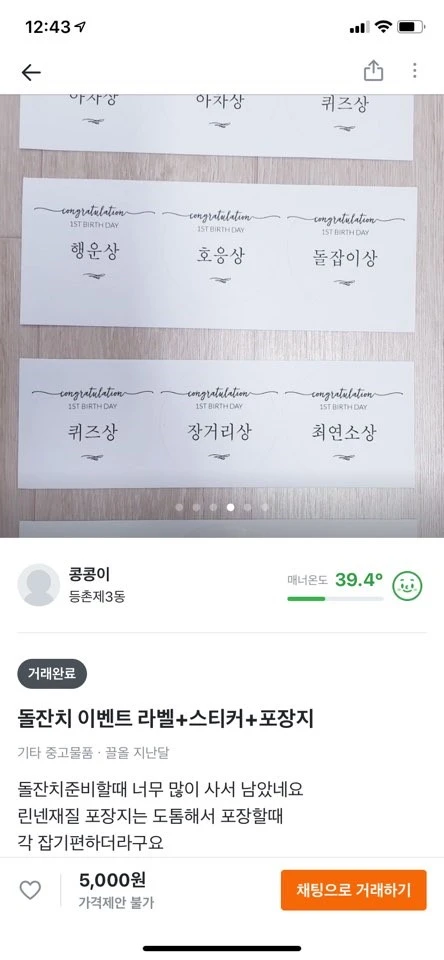 근데 이걸 포장을 해서 드려야 하는데, 포장지도 사야겠네? 하고 생각하는 마당에 당근 마켓에서 돌잔치하고 남은 포장지 파시는 분을 발견했다.