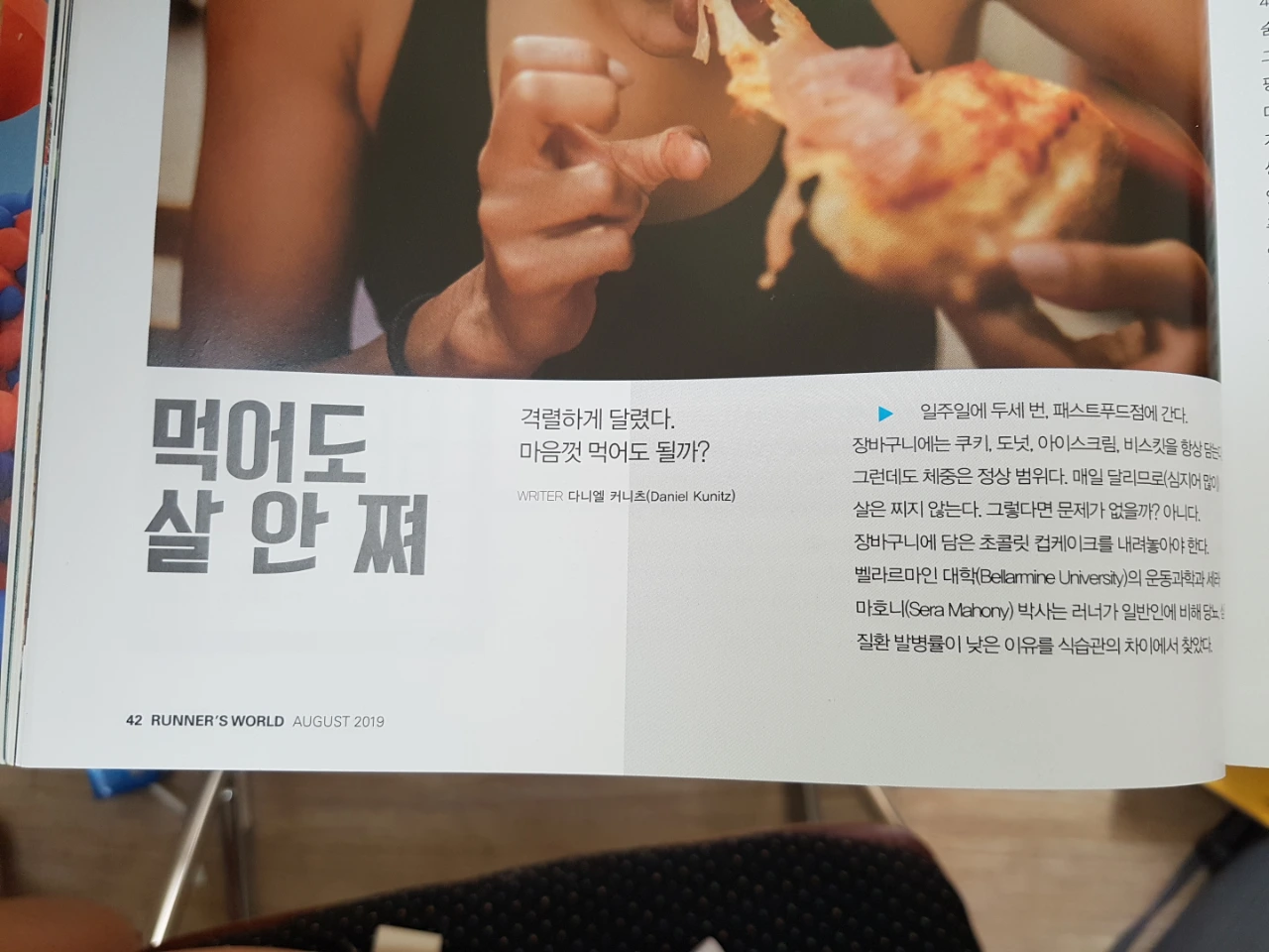 목차의 절반을 차지하는 것이 음식에 대한 이야기였다. 이번 호의 테마인 듯하다. 다이어트를 할 때도 운동이 2고 식단이 8이라고 할 만큼 먹는 것을 강조하니, 달리기라고 다를 것은 없다. 나는 러너로서 제대로 먹고 있는가? 퇴근 후 달리기를 하고 나면 기름진 음식에 맥주를 기분 좋게 마신다. 당 떨어지면 안 된다며 초콜릿과 카라멜을 어떤 가방에라도 항상 넣고 다닌다. 그러고선 생각한다. '나는 이 정도는 먹어도 괜찮지. 몸무게도 현상 유지되니 안심이네'라고.