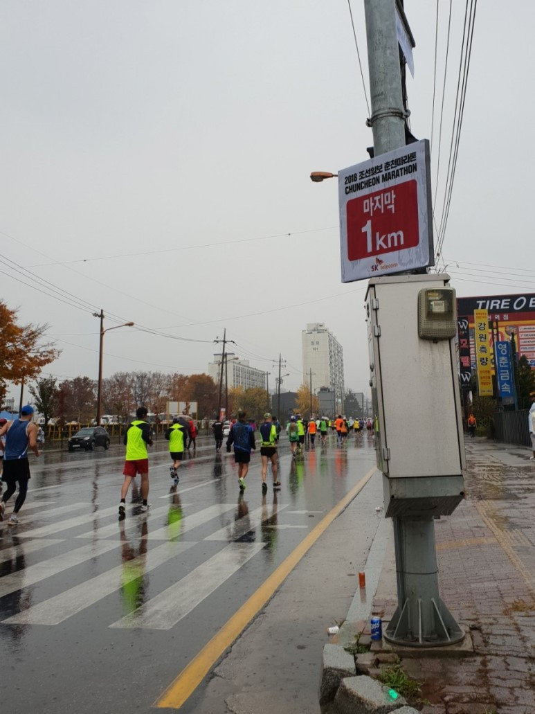 남춘천역에서 내려서 대회장으로 향하는 길에 하늘이 흐리긴 했지만 설마 비가 오리라고는 생각하지 못했다. 그런데 대회장에 도착해서 출발 대기 중에 비가 쏟아지기 시작했다. 못 뛰어서 다행이라는 생각이 들 정도의 비였다. 그러나 장대비에도 아랑곳하지 않고 주자들은 9시 출발 시각이 되자 본인들이 뛰어 내야 할 길로 향했다. 나는 그들에게 파이팅을 외치며 천막 아래에서 대기하고 있었다. 10시가 가까워지자 비가 멎어 들기 시작하기에, 택시를 타고 20km 지점 부근인 신매대교로 이동했다.