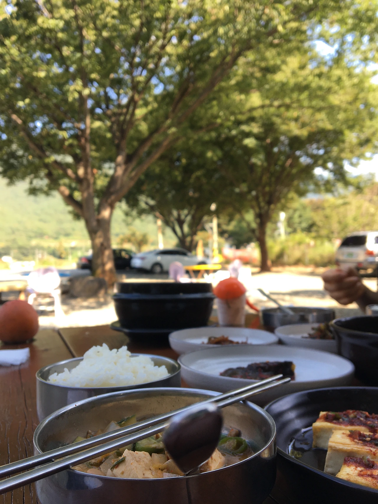 7. 된장찌개가 먹고 싶어 올라오던 길 봐 두었던 집으로 차를 돌렸다. 사하촌 식당들은 대개 그만그만하여 부러 좀 떨어진 마을에 마당이 넓은 집으로 왔다. 가을 하늘이 좋아 밖에서 식사를 해도 괜찮냐고 했더니 선선히 그러라고 한다. 마당 한편에 백구가 묶여 있어 한참을 같이 놀았다. 순한 줄 알았는데 다른 손님에겐 사납다.