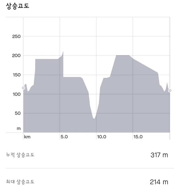 고속도로라 고저차가 별로 없을 줄 알았는데 오산이었다. 달리고 난 후 코스의 경사 그래프를 보고 깜짝 놀랐다. 이렇게 오르락내리락하면서 하프를 달렸다.