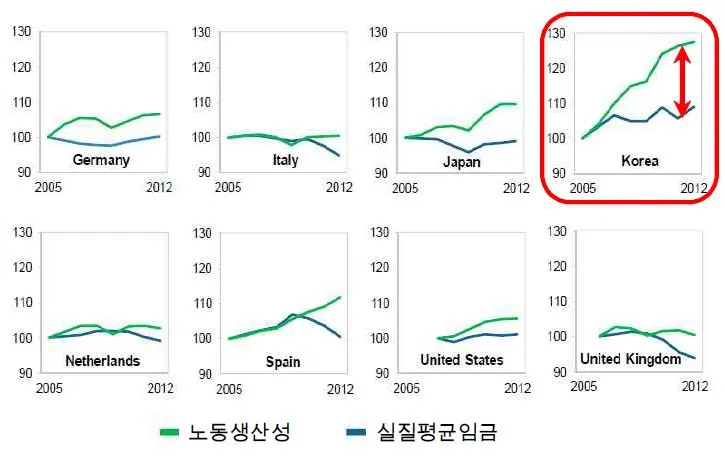 [그림 2]는 각 국가의 2005년부터 2012년까지 노동생산성과 실질 평균임금의 변화를 나타내는 그래프이다. 이 그래프에서 각 국가의 두 지수 간의 격차가 시간이 흐를수록 점점 더 커지는 것으로 분석되었다. 다시 말하면 노동생산성의 증가가 실질임금에 반영되지 못하여 소득불평등이 시간이 흐를수록 심화되고 있음을 보여준다. 특히 우리나라의 경우 그 격차가 다른 국가에 비해 크고 그 현상도 빠르게 전개되고 있음을 알 수 있다. 따라서 이런 경향을 시정하지 않을 경우 소득 불평등이 확대되어 성장에 부정적 영향을 미치게 될 수 있다. 향후 이를 해소하는 것이 지속 가능한 성장을 위한 핵심 요소가 될 수 있음을 시사한다.