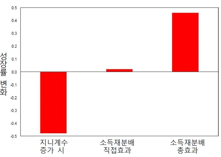 IMF의 분석 결과 소득 분배는 그 자체가 가지는 정당성 외에도 적절한 소득 분배를 통해 성장에 긍정적 영향을 미칠 수 있음을 보여준다. 특히, 소득 상위 20%의 부유층의 소득이 증가할 경우 오히려 중기적으로 GDP 성장률은 감소하는 것으로 나타났다. 즉, 상위 계층의 소득 증가는 소위 말하는 낙수효과(trickle down effects)로 나타나지 않으며, 오히려 경제 성장에 저해가 된다는 것이다. 반면, 소득 하위 20%의 빈곤층에 대한 소득 분배가 증가하면 GDP 성장률이 높아진다. 빈곤층과 중산층에 대한 소득 증가는 그들 계층이 경제적, 사회적, 정치적 채널과 상호 연관되어 있어 증가된 소득이 성장에 중요한 동력으로 작용하는 것이다(IMF 2015). IMF의 다른 연구도 아래 [그림 1]에서 보는 바와 같이 소득 재분배가 이루어졌을 경우 경제성장률에 긍정적인 것으로 나타났다.