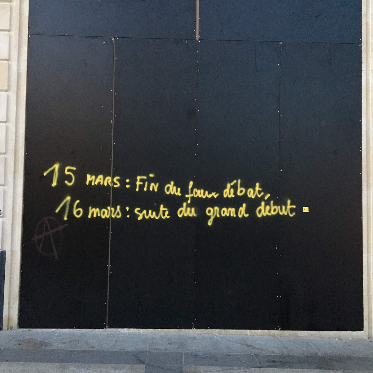 오늘 약탈과 방화로 뒤덮인 샹젤리제 거리 어딘가에 잘못된 토론회는 끝나고 위대한 시작이 뒤따를 것이라(fin de faux débat, suite du grand debut)는 낙서가 있다. 토론회가 끝나기를 기다렸다는 듯이 시작한 격렬한 오늘 시위는 오전부터 해가 질 때까지 계속되었다. 샹젤리제 양쪽으로 도열한 각 브랜드의 플래그쉽 상점들은 몇 군데 예외를 제외하고 모두 밴덜리즘의 제물이 되었다. 은행, 의류, 액세서리, 커피숍, 레스토랑, 신문가판대 가릴 것 없이 모든 곳이라 해도 될 만큼 광풍이 휩쓸고 지나갔다. 삼성 전시장도 피해 가지 않았다. 다만 다행인지 불행인지 깨진 방탄유리 위에 스프레이로 미안해 삼성(Désolé, SAMSUNG)이라 휘갈겨져 있다.