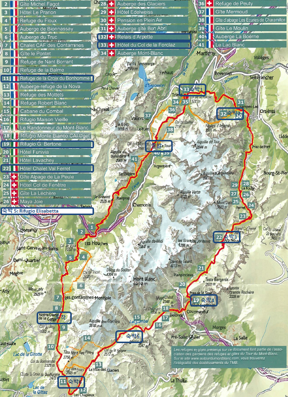 참고: 몽블랑 트레킹(Tour du Mont Blanc)은 프랑스, 스위스, 이탈리아 3국을 거쳐 170km 구간을 약 60시간에 걸쳐 6박 7일 동안 걷는다. 고도 1500에서 2500 사이를 오르락내리락 하니 사실 걷는다기 보다는 산행을 한다는 편이 더 어울리는 표현이겠다. 하루에 6시간씩 걷는다고 보면 10일 정도 걸리는 코스다. 나는 7일 일정으로 코스 중간에 두 번 차량으로 이동하고 하루 15~25km 사이를 걸었다. Le Tour에서 시작하여 반시계 방향으로 돌면서 6박을 하고(숙박한 산장은 파란네모로 표시) Notre-Dame de la Gorge에서 트레킹을 마치다.
