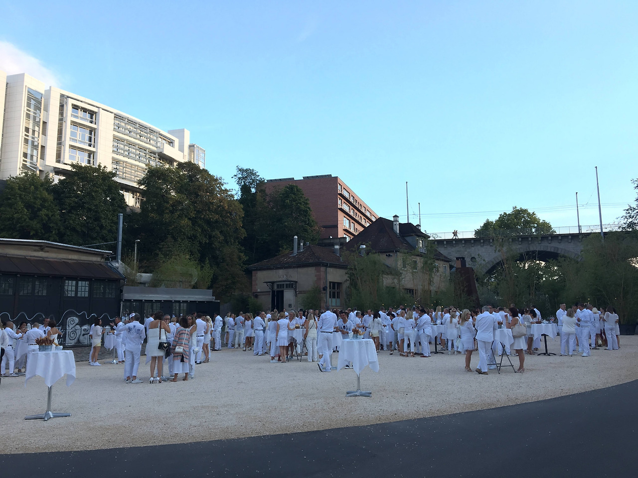 이제 다시 버스 타러 가야지 하며 대충 감으로 가고 있는데 저 너머 흰색 한 무리가 보인다. 시간은 남았고 바젤 사람들은 뭐 하고 노는지 궁금도 하고.. 족히 이백 명은 돼 보인다. 모두 흰색으로 드레스 코드를 맞추고 야외에 차려진 파티장에서 흥겹다. 친구들과 카페 빌려서 이러고 놀면 어떨까 하는 생각이 든다.