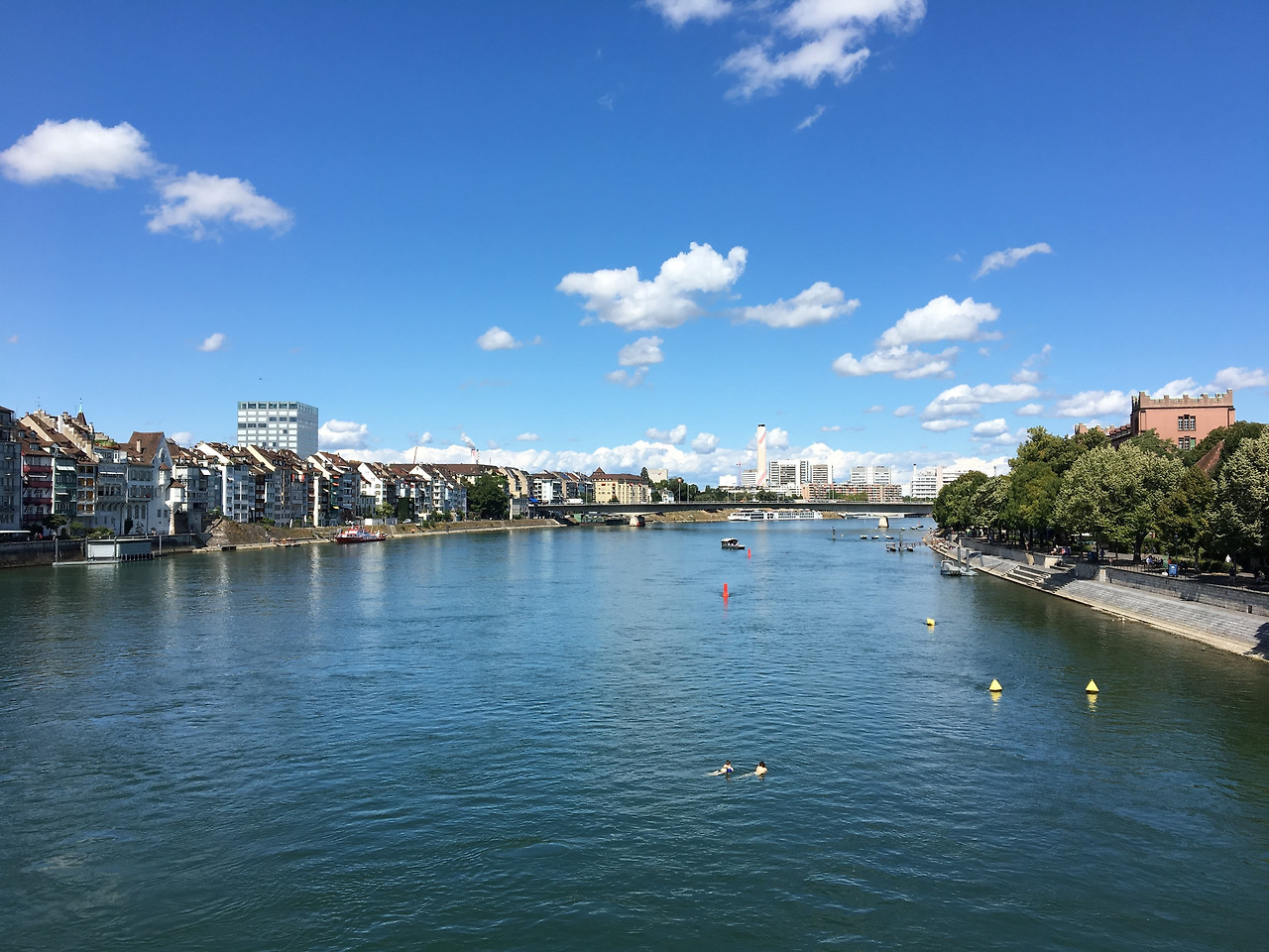 점점이 강물에 떠 있는 사람들이 보이는가? 바젤의 여름은 역시 강수욕이다. 도시를 관통하는 라인강은 폭도 상당, 깊이도 상당. 아침 열 시부터 강변에 보이기 시작하던 젊은 연인, 늙은 연인, 어린 연인, 가족단위 나들이객에 또래 친구들 무더기, 때론 우아한 솔로.. 오후에 접어드니 여름 강을 즐기기 위한 시민들이 떼 지어 나오고 해 질 무렵엔 강물 위에 마련한 무대에선 밴드 공연까지 펼쳐진다!!