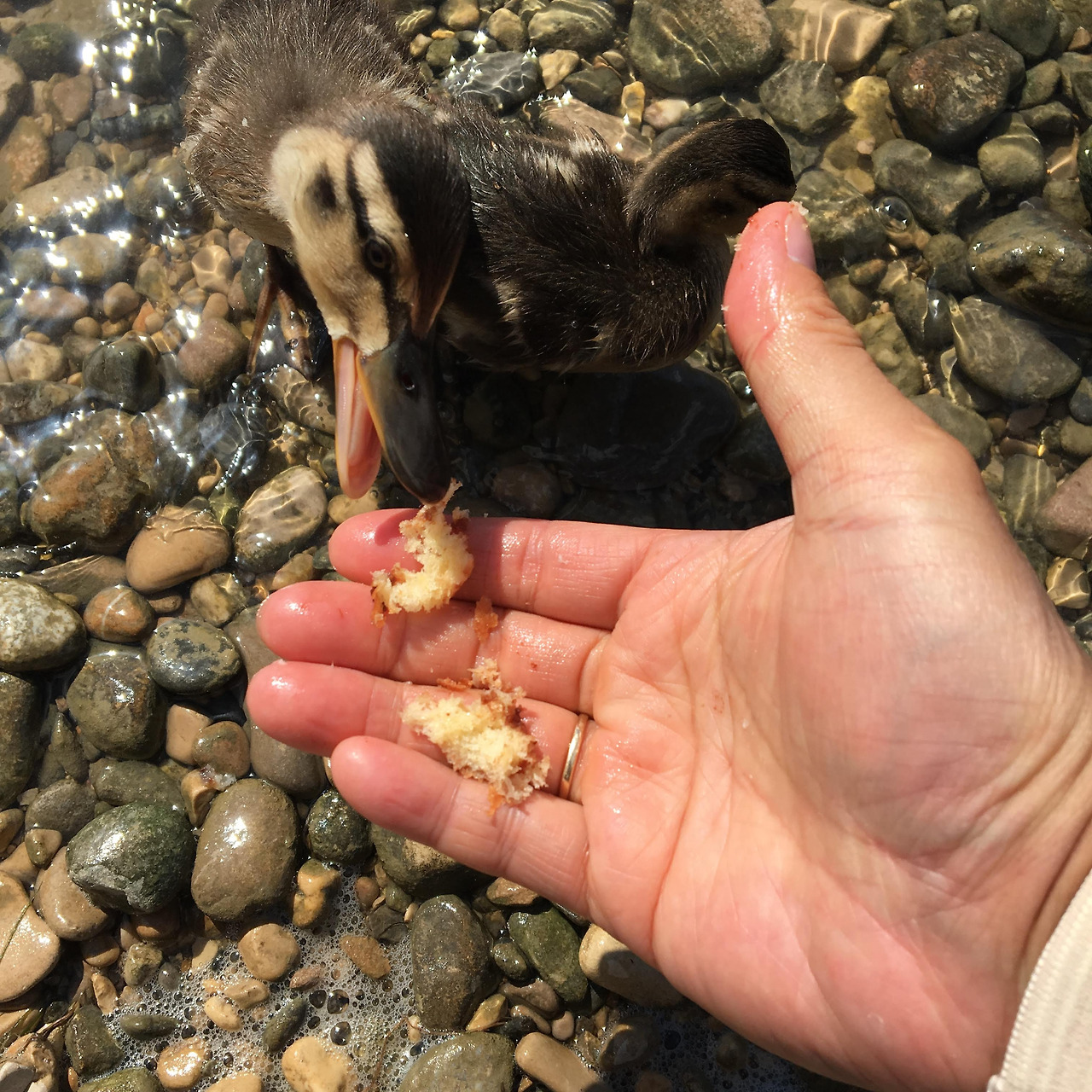 여우와 어린 왕자가 길들여지는 것에 대해 이야기했다지.. 마다가스카르 동물들은 사람들을 피하지 않는다는 이야기를 듣고 그 동네 한번 가봐야겠네라는 생각이 들었는데.. 여기 바젤의 오리들도 사람을 피하지 않네. 가져온 간식거리를 손바닥에 올려놓으니 새끼 오리들이 너도나도 몰려와 성황이다. 엄마는 근처에 맴돌 뿐 아기들이 사람들과 어울리는 걸 말리지 않는다. 따로 몇 조각 떼서 엄마 앞에 주었다. 아마도 바젤 사람들과 오리들 사이에는 서로를 친구나 이웃으로 여기는 관계가 형성되었나 보다. 오리를 친구로 만든 이곳 사람들의 심성이 급 좋아지기 시작한다.
