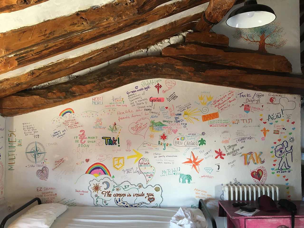 오늘 도착한 알베르게는 집의 다락을 개조한 곳인데 순례자들이 남긴 글과 그림으로 가득한 벽과 조용한 마을이 내다 보이는 조그만 발코니가 있다. 마을을 보면 어떤 사람들이 살고 있는지 짐작이 간다. 앞으로는 도시 그리고 공립은 피하고 작은 마을 작은 알베르게를 찾게 될 것이다.