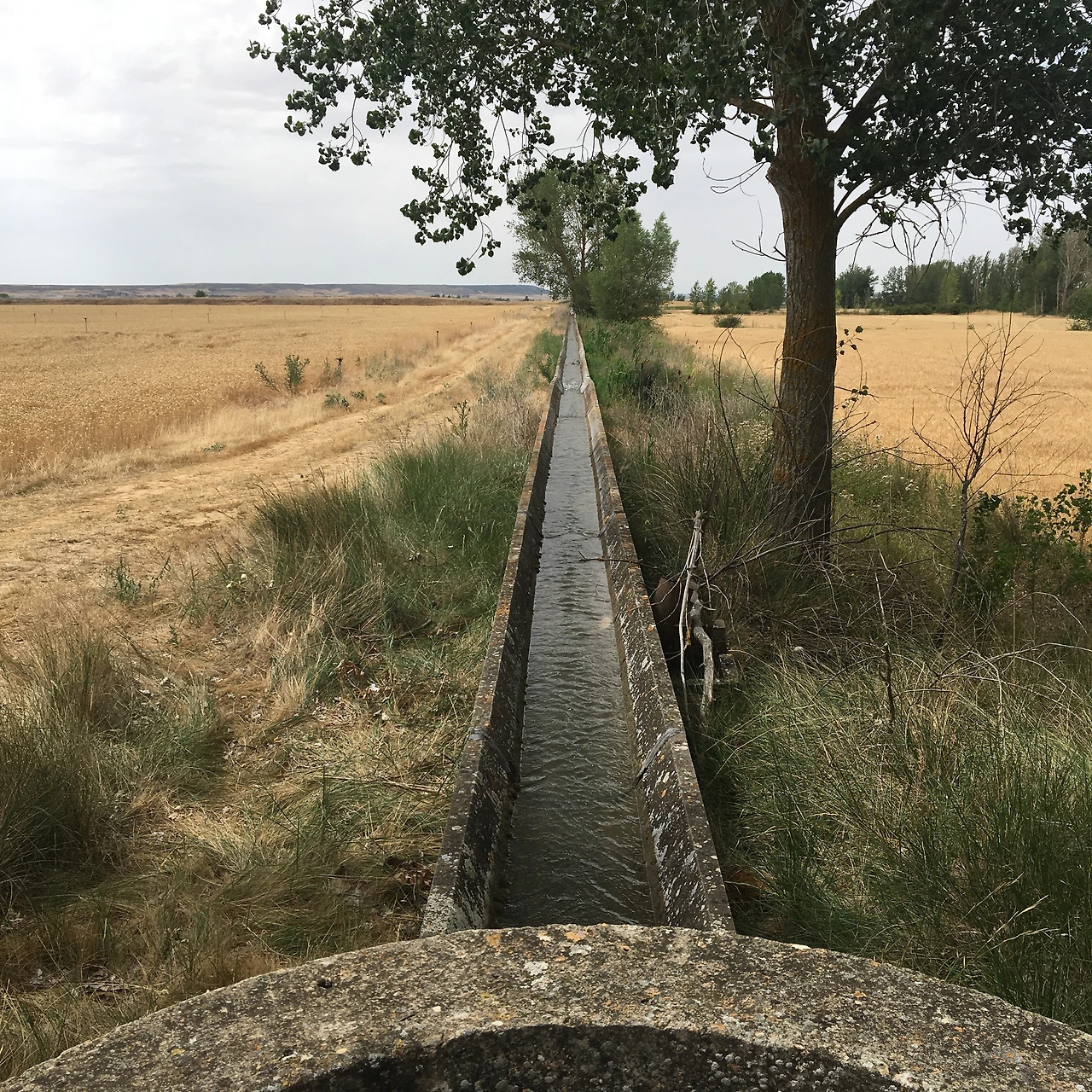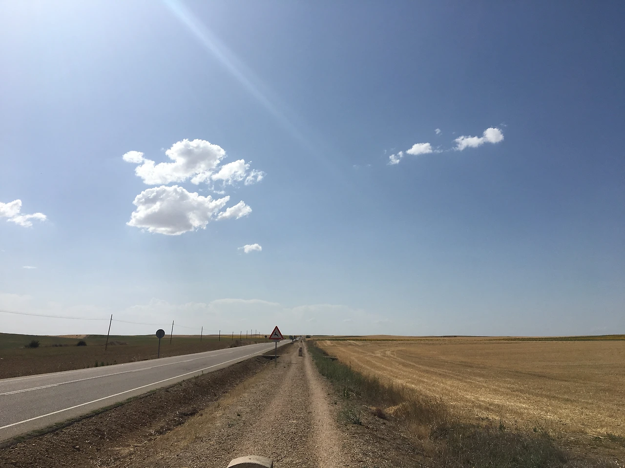 지평선과 맞닿은 평야는 우리나라에서는 김제나 가야 볼 수 있다. 여기 까미노를 13일 걷는 동안 수도 없이 보았다. 오늘 높게 쌓은 제방길, 그 사이 가득히 흐르는 물과 지평선 너머 아스라이 뻗어 있는 대지의 실핏줄과 같은 관개수로를 보며 풍요를 생각한다.
