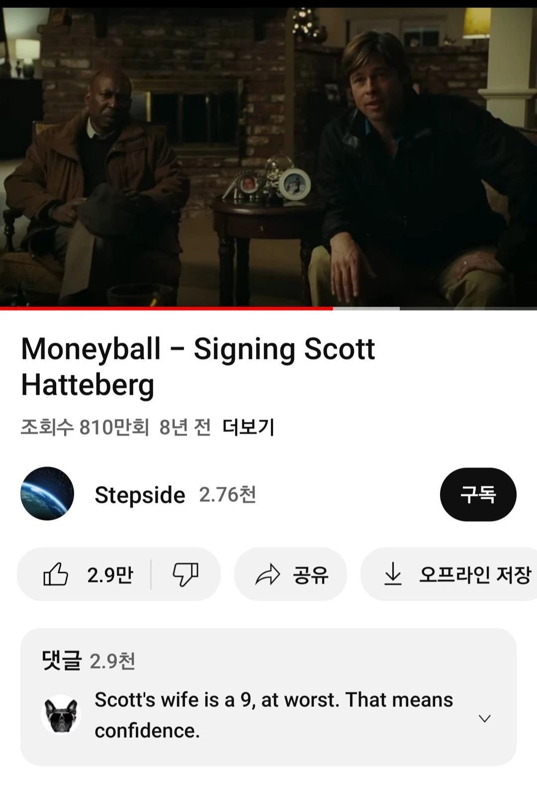이 영화장면은 유튜브에 "Moneyball - Signing Scott Hatteberg"라는 제목의 동영상으로 소개되어 있다.