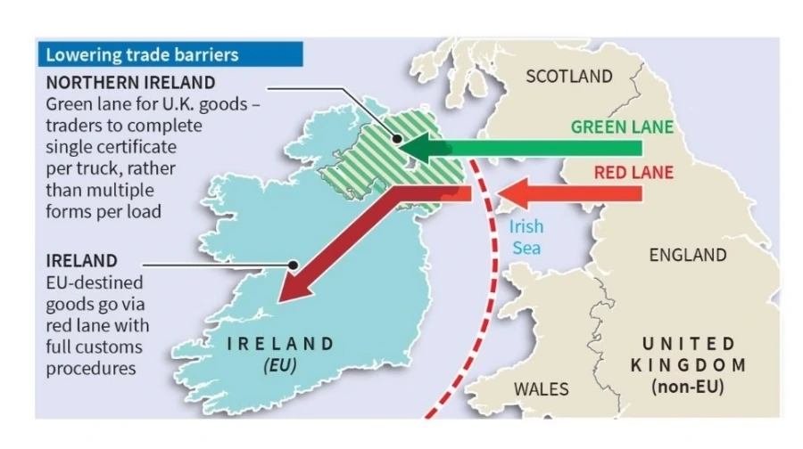 영국이 EU탈퇴당시 북아일랜드와 아일랜드공화국의 사이에 인위적 국경장벽을 설치하기 어렵다는 정치적, 사회적 사정 때문에, EU 측은 영국(보리스존슨총리)과의 협의를 통해 북아일랜드는 예외적으로 EU단일시장에 남게 허용해 주었습니다. 이 특별 협정을 일컬어 북아일랜드특별협정(Northern Ireland Protocol)이라 부릅니다.