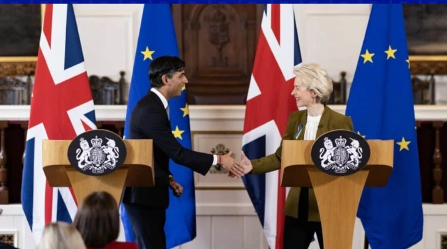 영국의 리니수낙 총리와 EU집행위의 폰데르라이넨위원장이 공동발표 후 악수하는 장면