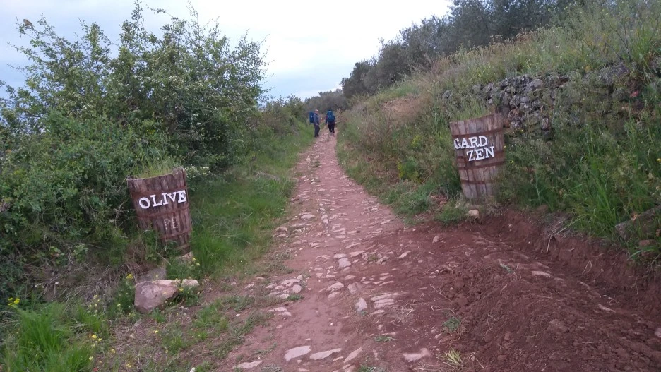 멀리 앞서가는 순례자들의 모습이 보인다. 좌우측에는 올리브 농원인 듯...