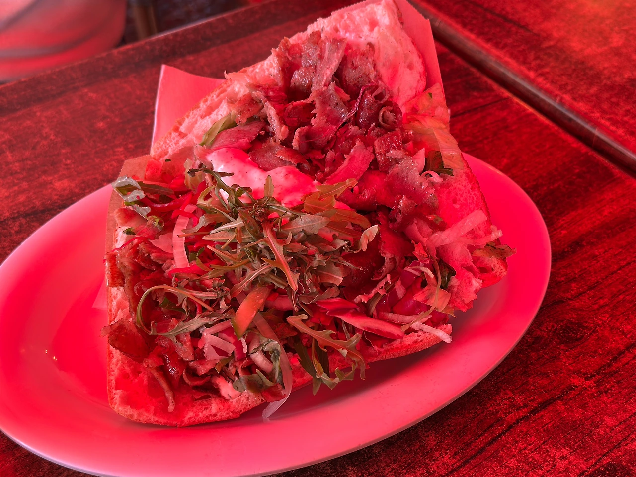 우리는 빵에 구운 고기와 재료를 넣어 나오는
