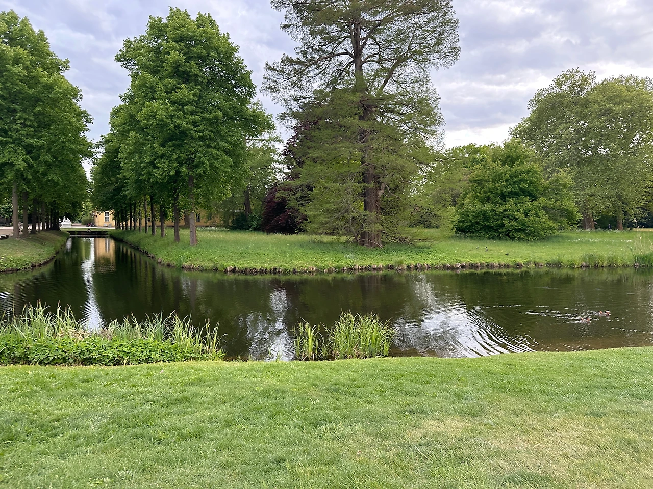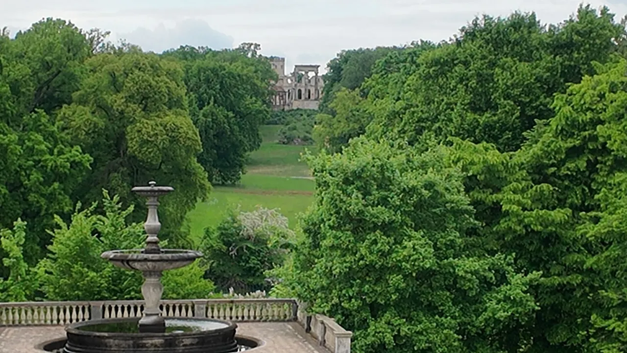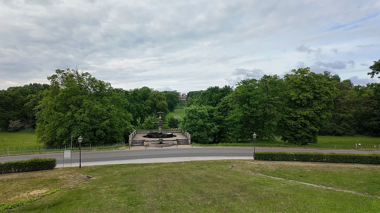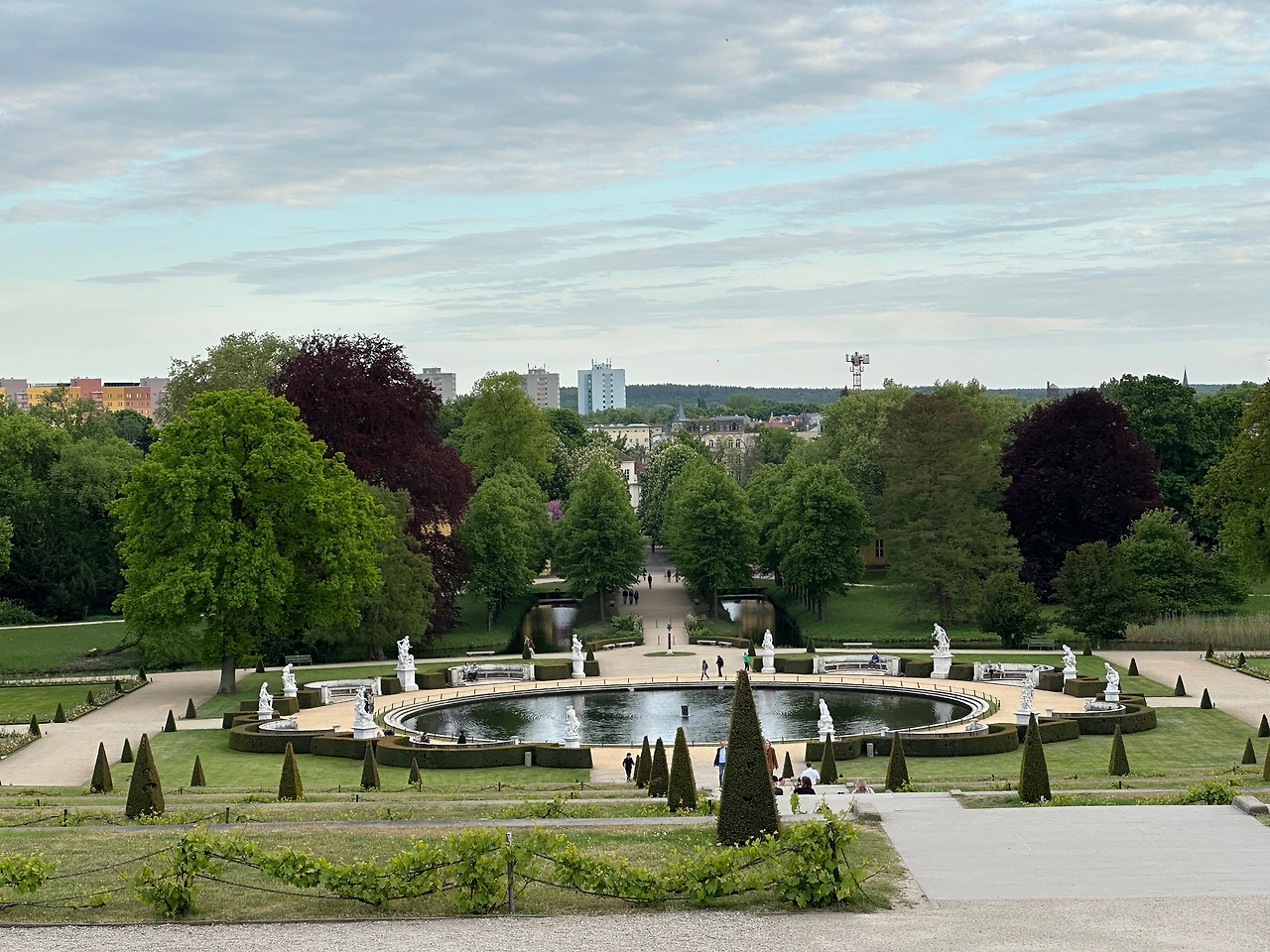 분수 너머로 길게 뻗은 산책로와 숲, 포츠담의 현대적인 건물까지 한눈에 들어오는데