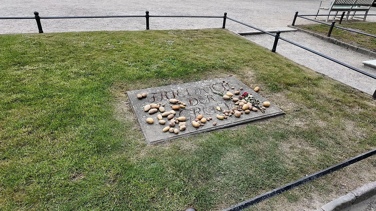 무덤 위에 감자가 놓여있는데, 이는 프리드리히 대왕에게 감사함을 전하는 사람들의 마음이란다.