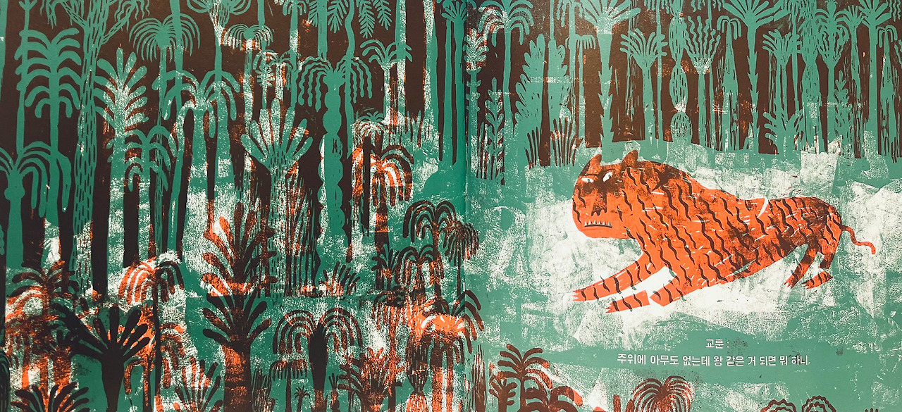 <왕이 되고 싶었던 호랑이>는 어느 날 아침잠에서 깬 호랑이의 뜬금없는 자기 선언으로 서사가 시작된다. 나아가 모든 동물이 변화를 외치고 있기 때문이라는 명분 내지는 망상에 빠진다.