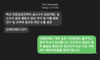 갖은 우여곡절 끝에 겨우 데이터 수집을 마친 지 한 달쯤 지났을 무렵, 새벽의 적막을 깨는 문자 수신음에 인내심의 끈이 탁, 하고 끊겨버렸다. 이 늦은 시간에 이렇게나 침습적인 문자 메시지라니. 수집한 데이터 목록에서 연락처를 대조해 발신자의 응답을 찾아냈다. 서울 소재 교육청 Wee센터에서 일하는 30대 여성 상담사를 ‘자처한’ 응답자가 108문항에 답하는 데에 걸린 시간은 약 3분. 모든 응답이 4 또는 5로 줄지어 있었다. 한 번 더 속는 셈치고 핸드폰에 연락처를 등록해봤다. 카카오톡 새로 추가된 친구의 프로필 사진에 자리한, 40대는 족히 되어 보이는 남성의 얼굴을 보고, 나도 모르게 실소가 새어나왔다.