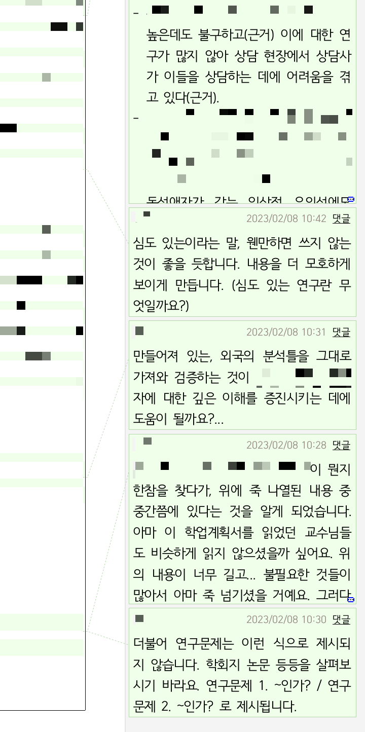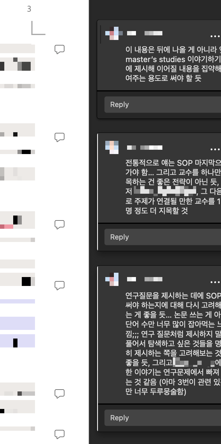 그간 학업계획서 첨삭 요청에 많은 시간과 에너지를 들여왔습니다. 다소 완벽주의적인 성격 탓에 누구에게든 대충 피드백하지 않았거든요. 하지만 들인 노력이 무색하게 제 피드백을 감정적으로 받아들이거나, 결과물에 만족하지 못하는 경우가 드물게 발생했기에… 첨삭 과정과 결과물을 좀 더 구체적으로 제시함으로써 발생 가능한 오해를 미연에 방지하고자 합니다.