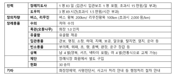 상조상품을 가입해두지 않아 걱정부터 했지만, 장례식장에서 제공하는 장례품목은 미리 상조상품을 준비하지 않았어도 매우 만족스러웠다. 유족들이 예측하지 못하는 상황에 장례지도사님께서 도우미 분들과 면밀히 살피시며 장례 품목들을 관리해 주신 부분이 컸다.