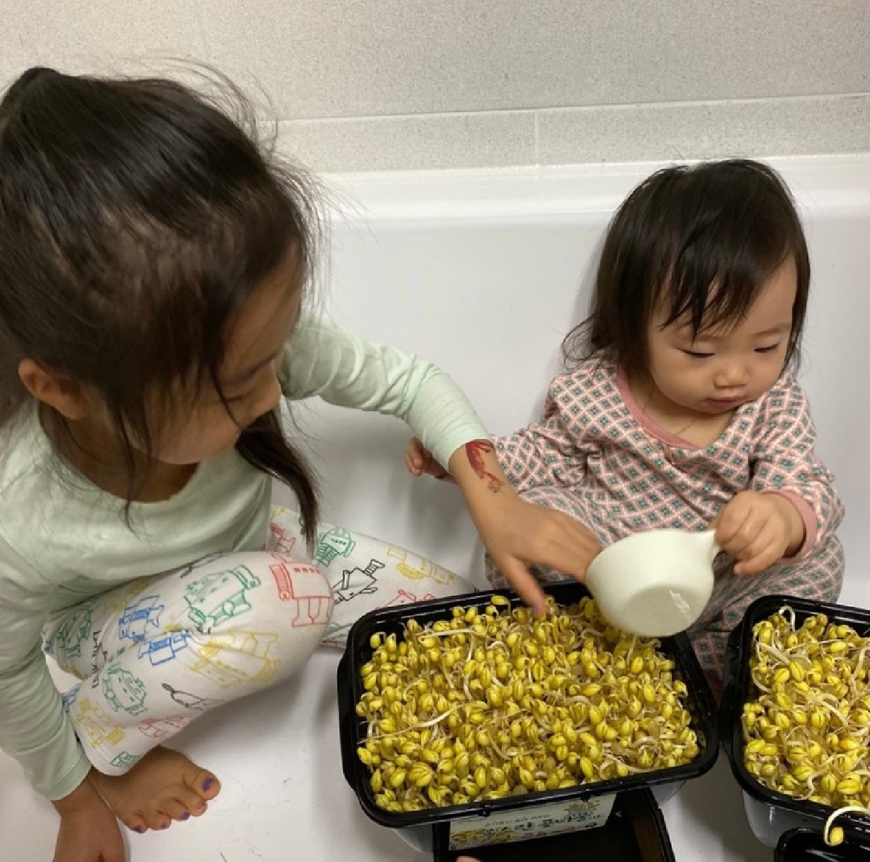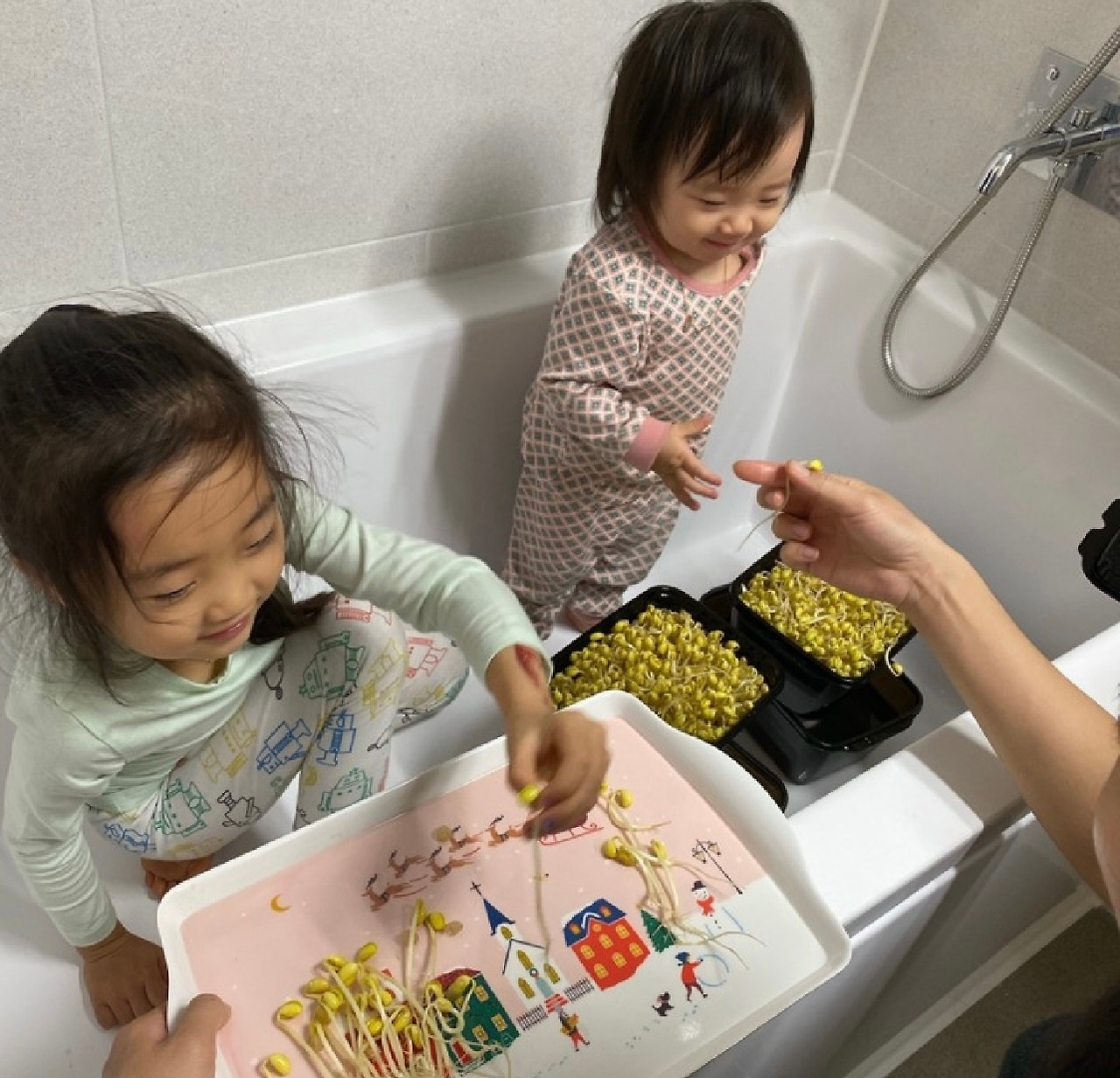발동동 손꼽아 기다렸던 주말이다. 드디어 첫 수확이다. 콩나물들에게 욕조를 양보한 우리 두 딸들은 수확의 기쁨을 온몸으로 느낀다.