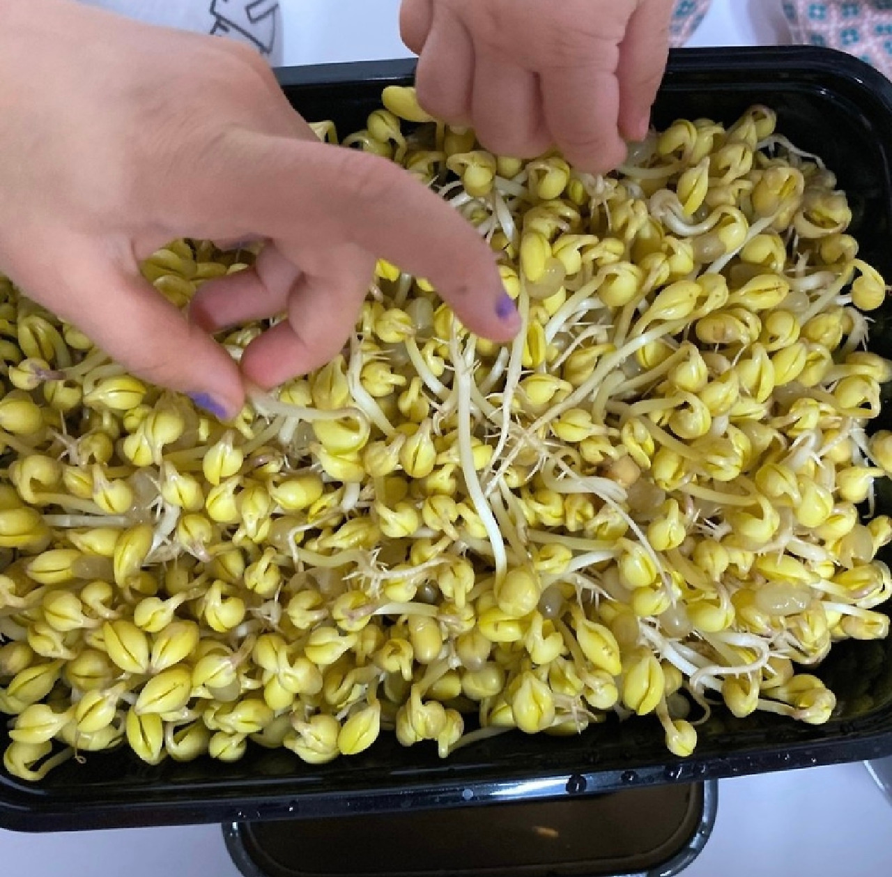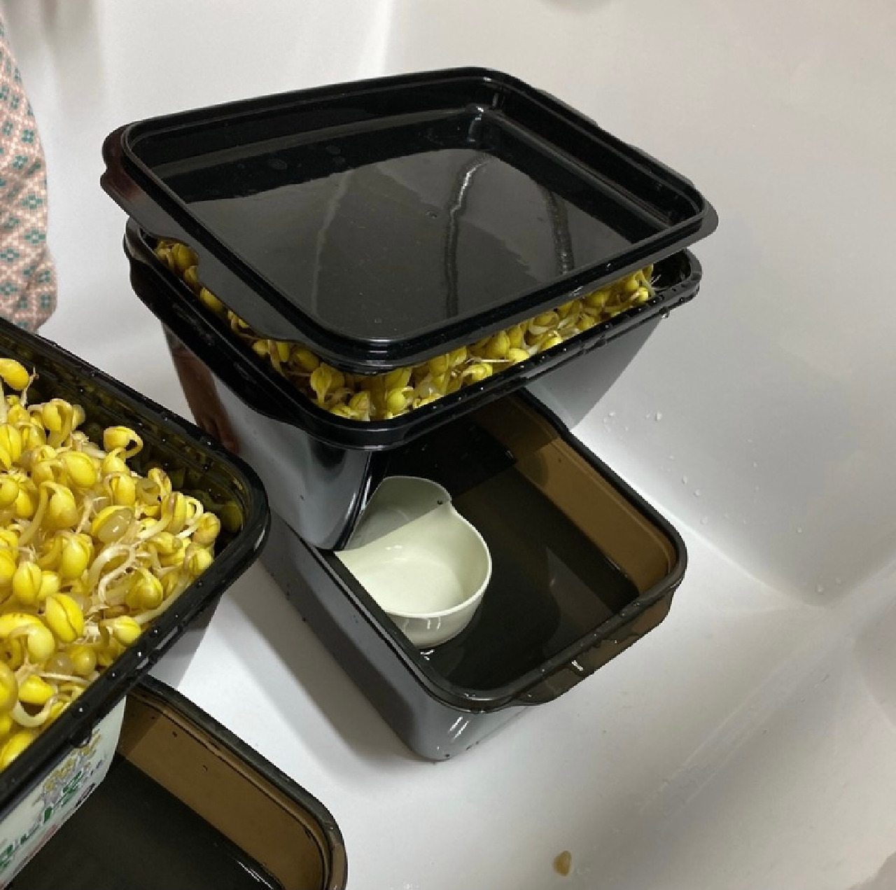 두 번째는 집콕 트렌드에 힘입어 집에서 콩나물 키우기가 유행이라며 선물 받은 콩나물 콩들을 원래 한 봉지씩 키워 야금야금 먹어야 하는데 통 큰 별아이는 콩나물이 맛있다며 두 봉지씩 두 박스를 해서 물을 담뿍담뿍 주었더랬다.