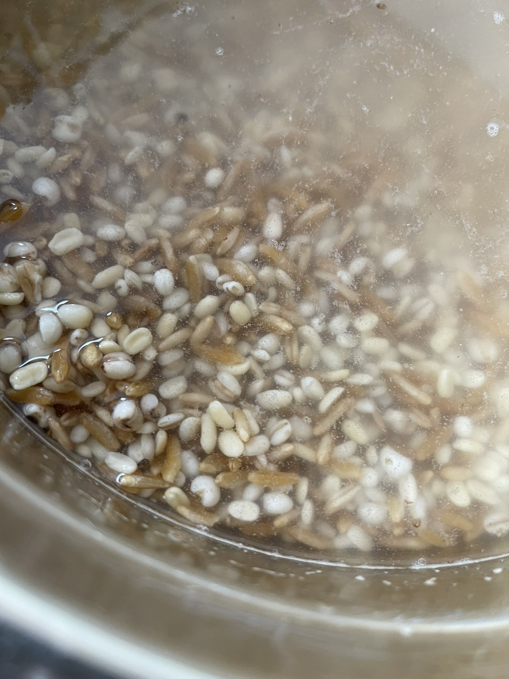 2. 율무, 카무, 녹두, 보리, 현미쌀, 귀리 4시간 불려요. : 충분히 불려요. 좋아하는 다양한 곡류를 넣으면 됩니다.